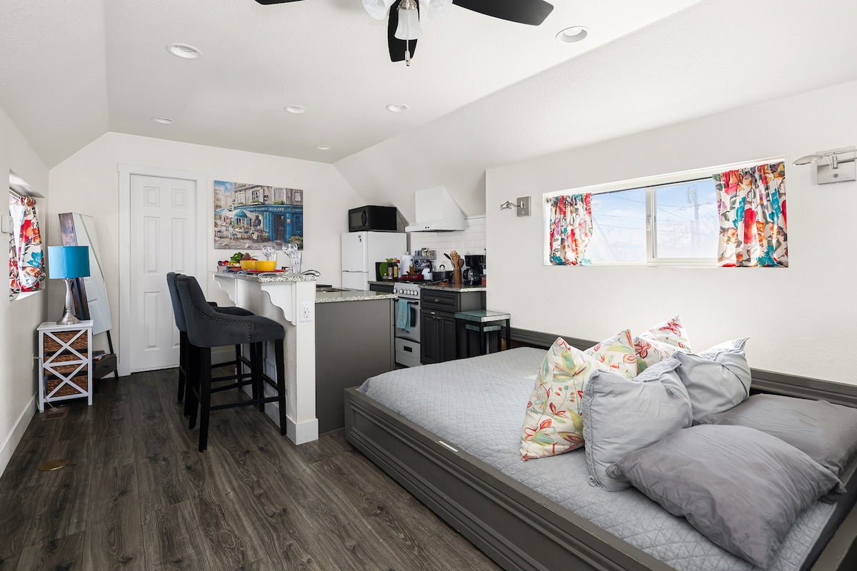 The Carriage House is at the back of our property. First class accommodations, stainless steel appliances, granite counter tops, radiant heated bathroom floor. Your own private secure garage, Garage 18’6” deep (not suitable for oversized vehicles) Level 2 EV charger (small fee applies) and a cozy 420 friendly patio. Convenient to premiere park, designer shops at Cherry Creek, business center, Ball parks, and entertainment district. All just a four-mile bike ride or a brief Uber.