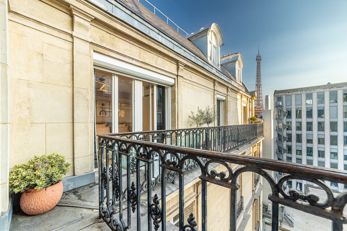 Appartement très agréable, au coeur de Paris, face à la Tour Eiffel ! lumineux car situé au dernier étage( 6 ème avec ascenseur) dans une rue très calme.Entièrement rénové en mars 2020 avec des matériaux et meubles de qualité ,bien équipé. Et bien sûr une terrasse bien sympathique pour se relaxer, prendre son petit-déjeuner au soleil! Et le soir venu déguster une bonne bouteille de vin tout en admirant la tour Eiffel illuminée!