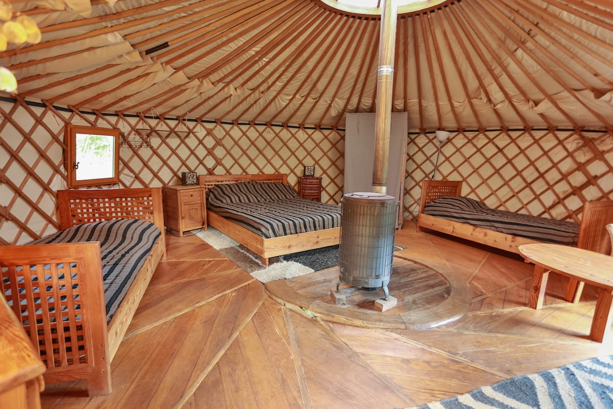 Notre yourte Toula vous séduira avec sa vue les champs et les oliviers. Équipée d'un lit de 140 et d'un lit de 90, c'est un hébergement insolite destiné aux amoureux ou à une petite famille de 3. En retrait des autres hébergements mais avec vue sur notre petit avion Cessna, vous pourrez observer les étoiles de votre terrasse. Plateau de courtoisie, ventilateur aux beaux jours et chauffage d'appoint hors saison et salle d'eau privée juste à côté. Bienvenue aux amoureux de Dame Nature !