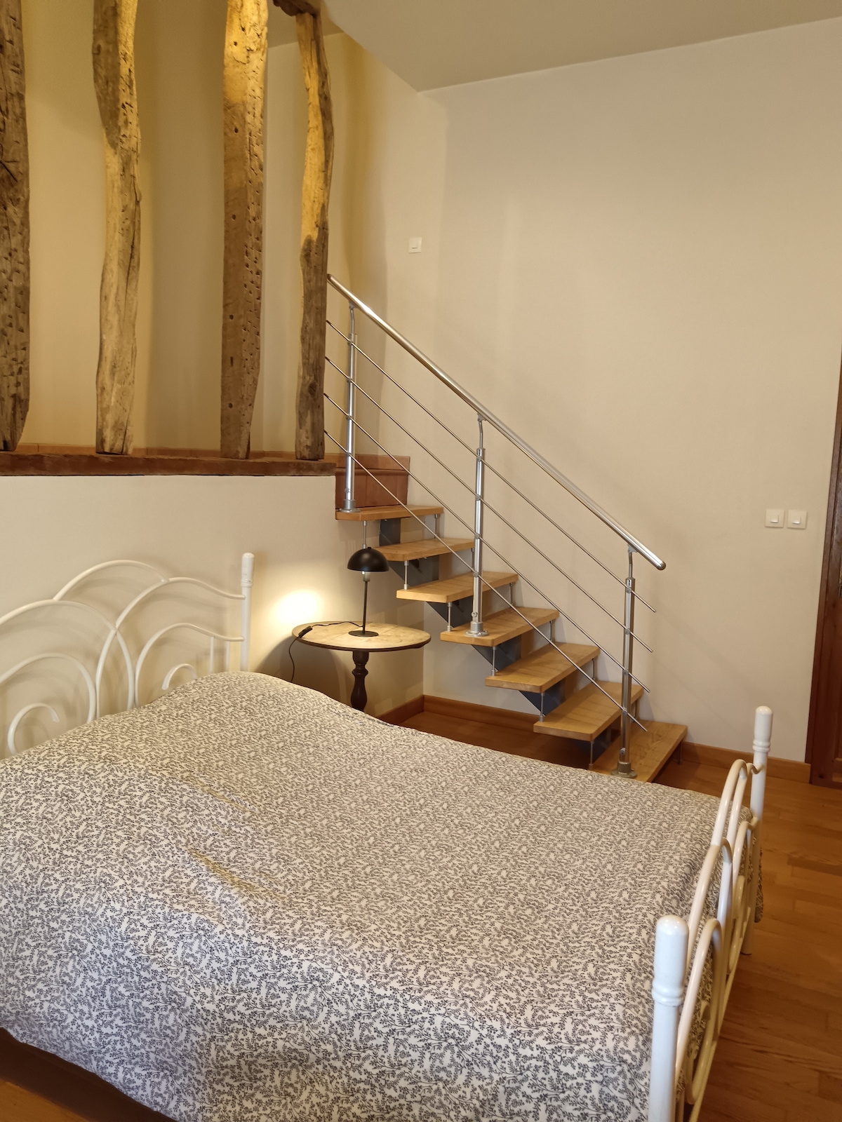 Dans un ancien corps de ferme , vous accéderez à votre chambre par un porche couvert. L'accès est complètement indépendant , la chambre se situe à l'étage d'une des dépendances de la maison familiale , vous bénéficiez d'une salle de bains privative et du nécessaire pour prendre un petit déjeuner ou une collation. Un micro-ondes est disponible ainsi qu'un frigo. Tout le charme de l'ancien ! La pierre et le bois donnent du cachet à cette belle grande chambre.