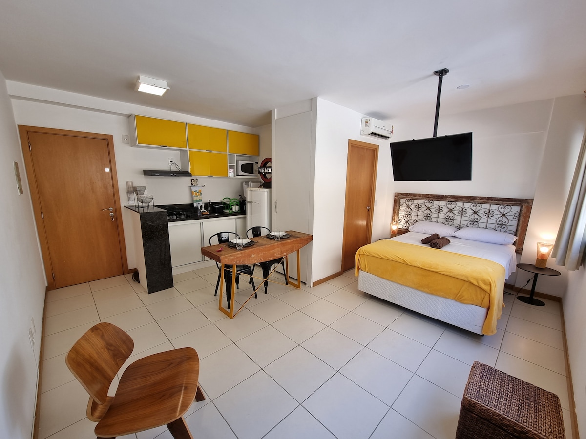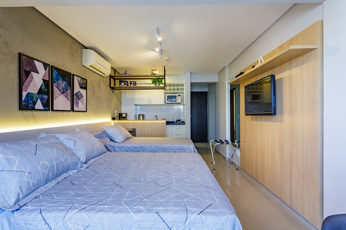 At the Cullinan Hplus Premium hotel. Very new and contemporary. Amazing location! Two malls across the street. Great tourist spots to go on foot. Charming, finely decorated and furnished unit. On the highest floor, with a beautiful view of Brasília and Asa Norte. 29m² luxury suite with king bed. Well equipped with several items for your convenience. Acoustic insulation on the windows for a great rest. Smart TV. Garage. Swimming pool, gym, sauna and restaurant. Check in 24 hours at reception.