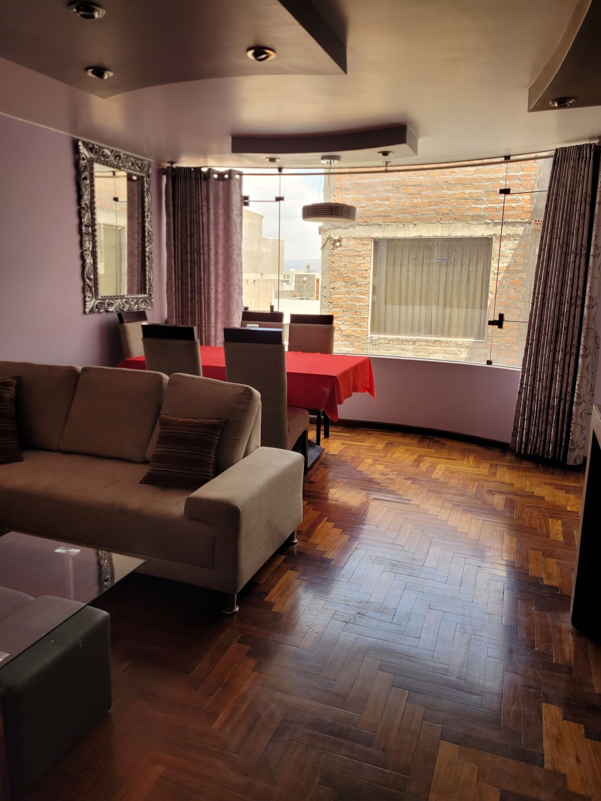 Disfruta de un minidepartamento independiente cómodo, ubicado en el cuarto piso, cuenta con baño completo, agua caliente de therma solar y therma eléctrica, cocina equipada con olla arrocera, licuadora, implementos de cocina, frigobar, microondas, comedor, una hermosa terraza independiente, lavadora, tv, wi-fi, muy cerca al centro histórico, a cinco cuadras de la plaza de armas. A 3 cuadras esta el restaurante Típica y Sambambaias, a media cuadra hay una playa de estacionamiento las 24 horas.