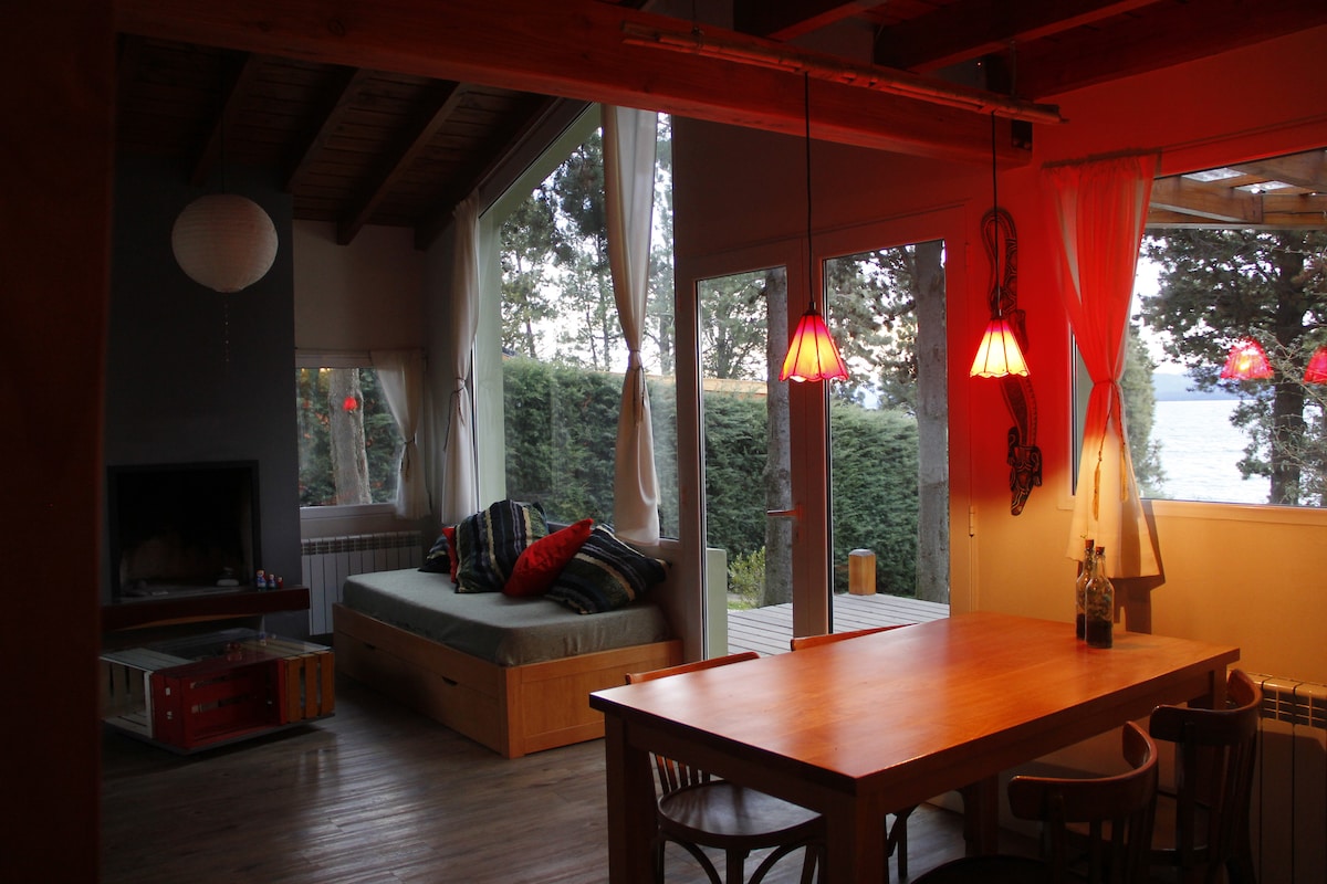 Cálida cabaña de estilo rústico a orillas del lago Nahuel Huapi con hidromasaje, hogar a leña, y deck. Monoambiente creado para el relax y el romanticismo con vista al amanecer y salida de la luna sobre el lago. Smart TV e internet por FIBRA OPTICA con wifi para trabajar. Una kitchinette con todo lo necesario, incluyendo cafetera dolce gusto. Caja de seguridad para resguardar tus notebooks al ir de paseo. Baño completo. Pool, ping-pong. Playa: Kayak y standup paddle. Desayuno continental.