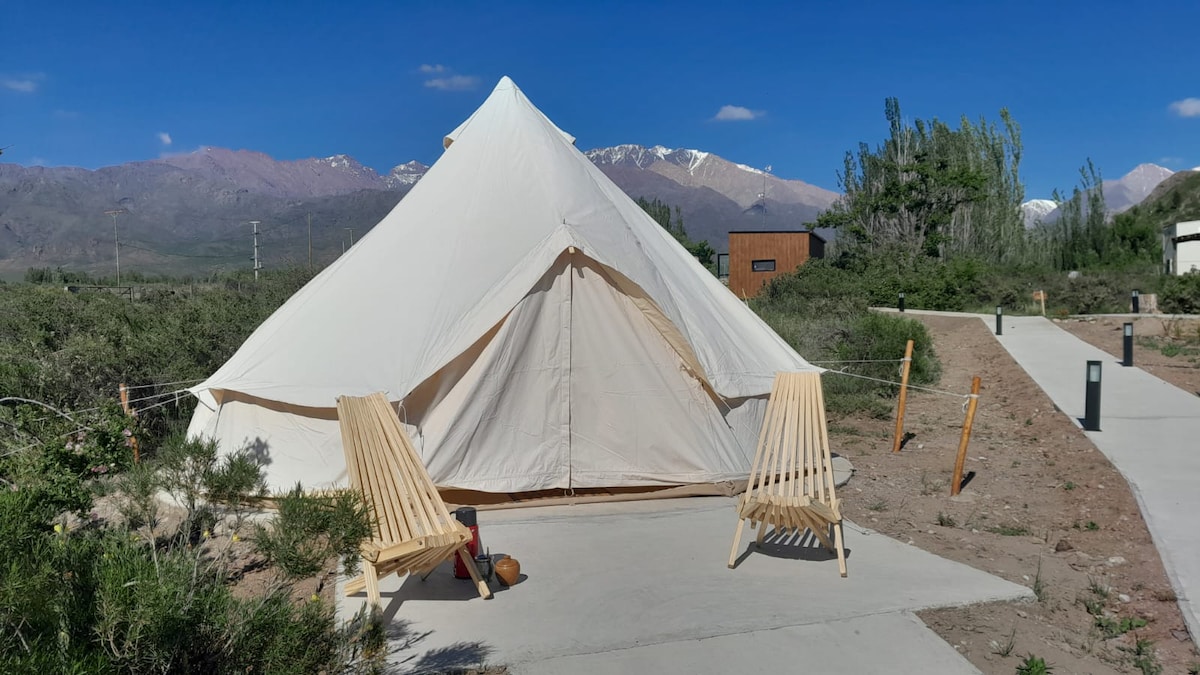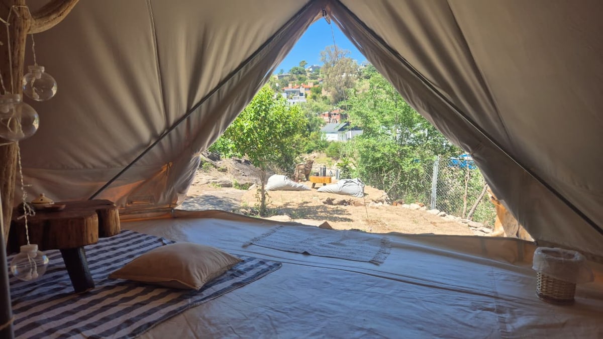 Alojamiento sostenible en un amplio parque con dos hermosas bell tent, acogedoras y respetuosa con el medio ambiente. La más grande cuenta con una cama Queen para dos personas y la otra satélite de un tamaño menor. En el exterior podrás disfrutar de una zona intima, rodeada de naturaleza, estupenda para relajarte en las hamacas, leer un libro o simplemente sentir. En Vivac podrás detenerte a observar un atardecer o simplemente contemplar una noche estrellada fuera de la ciudad.