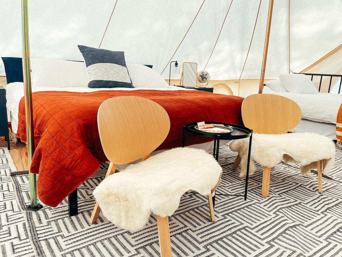Stay at The Embers Glamping and RV Resort, in one of our cozy bell tents! Our bell tents are heated and air-conditioned, so you can camp comfortably! Each features a king bed, single sleeper futon, coffee maker, mini fridge, picnic table and firepit. Our bath house with private bathroom suites is located nearby. All linens are included -just pack your bags and come ready to relax! As a guest here at The Embers, you'll have access to all the resort amenities!