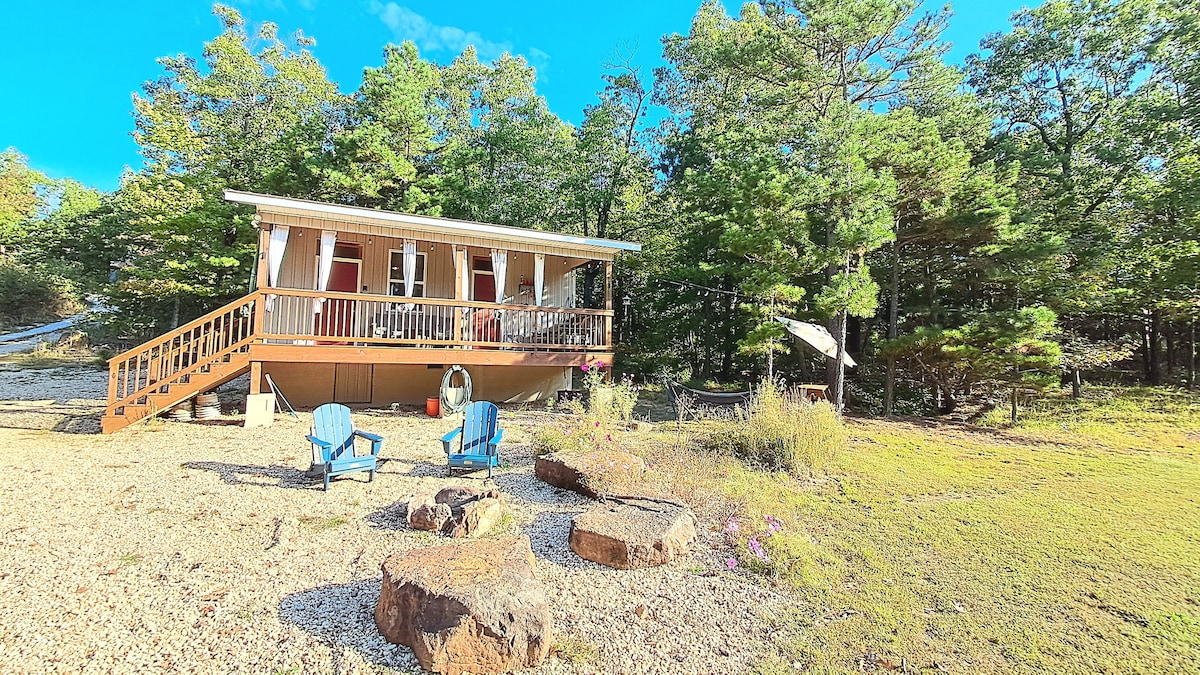 Welcome to Pedal and Perch, a custom-designed and built accessory dwelling cabin just minutes from downtown Bentonville, AR, Walmart HQ, and miles of incredible mountain biking. Enjoy a serene setting that tucks you among the trees and makes you feel like you are staying in your own treehouse. The cabin features a custom kitchen, one bathroom, a queen bed in the loft, a pullout sofa on the primary floor, and your very own outdoor bathtub looking in to the valley below.