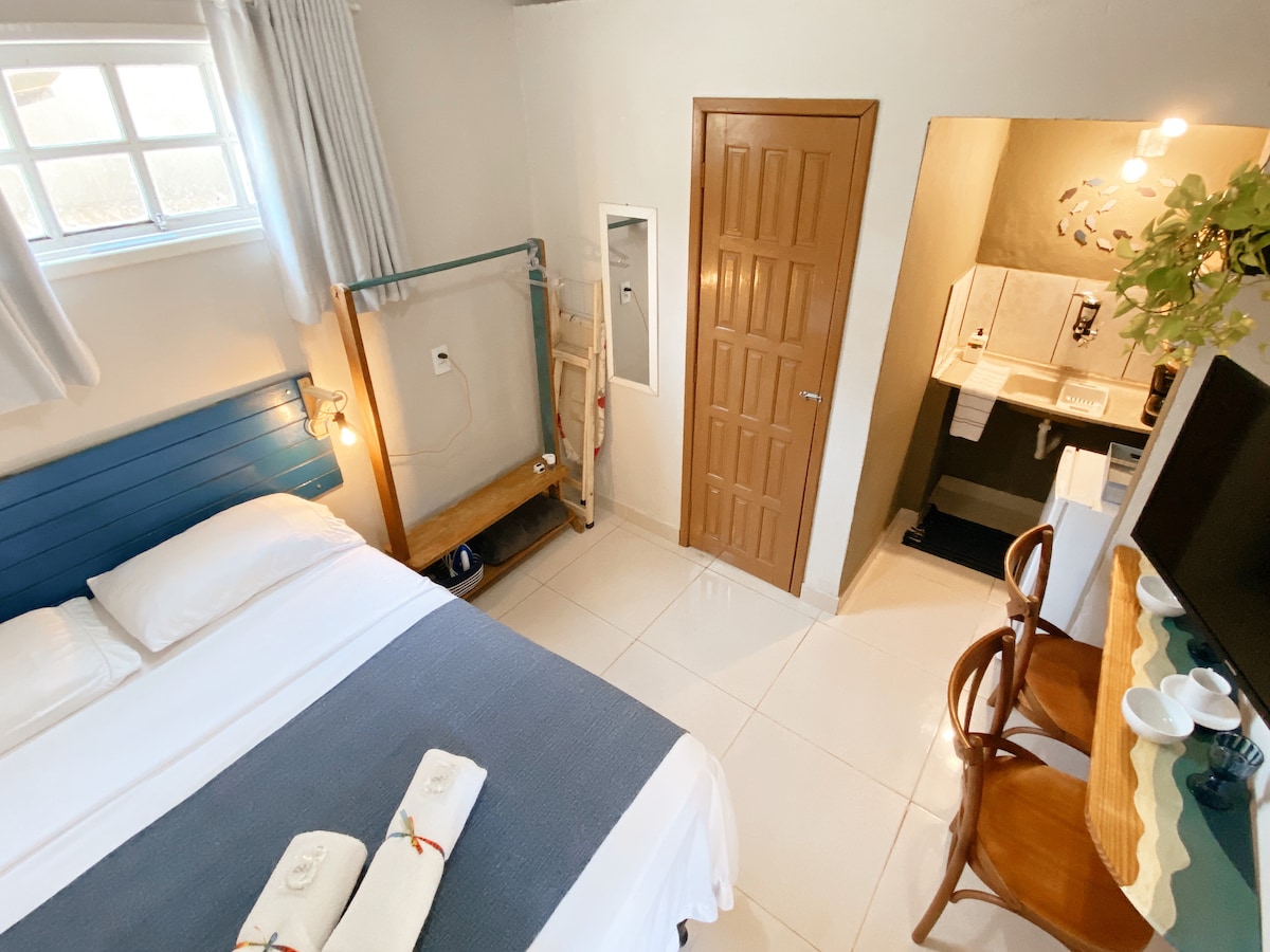 Melhor localização com vistas deslumbrantes para o mar! A apenas 10 min a pé da praia e a 3 min do centro de Arraial. Ao lado da rua do Mucujê, onde toda a vida noturna de Arraial se encontra. Os melhores restaurantes e bares estão a menos de 5 min do local. Desfrute do nascer do sol no mar incrível. Suíte luxo, cama super King size, banheiro espacoso com banheira, frigobar, ar condicionado Split, TV 55' e varanda. Cafe da manha incluso, servido no topo da falésia com vista incrível para o mar!
