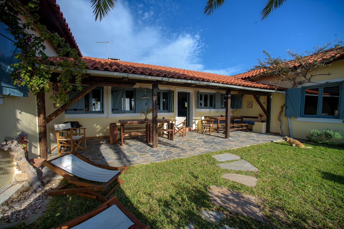 Welcome to Meda House, a place you can easily call home. Ideal for groups or families, the house has 2 floors with different entrances. Simply decorated with rustic nuances, our house has 2 bedrooms, 2 bathrooms, 1 living room, a fully equipped kitchen and 2 balconies from where you can enjoy a wonderful view... On the left you can admire the imposing mountains and ahead the Aegean Sea. During spring and summer the smell of orange and lemon blossoms from our garden will spoil your senses...