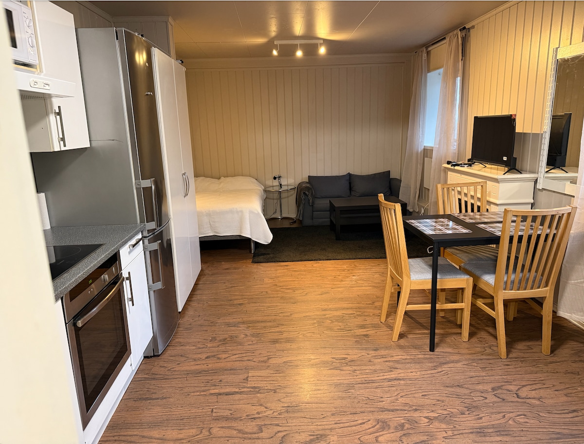 Ny lita leilighet, kjøkken og stue i ett, ett soverom og bad. Det er to sovesofaer i hoveddelen og 120-seng på soverom, så mulighet for å legge ned opptil flere om det trengs for ei natt, men er nok mest egna for færre ved lengre opphold. Her er det vedovn og hyttestemning innomhus, kort veg til fjord og fjell utomhus.