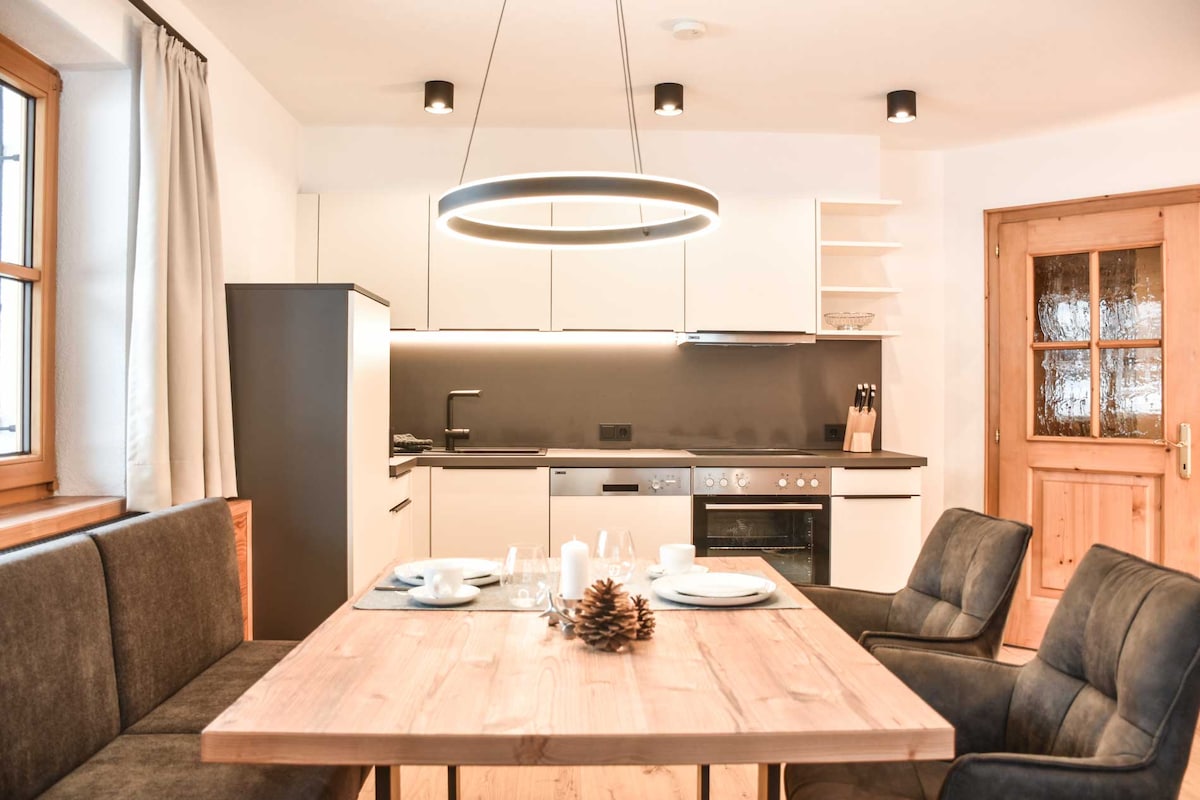 Our apartment offers a unique experience for body and soul with a fantastic view of the forest and meadows. The near-tangible nature is reflected in the furnishings: both the living area with the kitchenette and the cozy bedroom are furnished with natural fabrics (real leather) and warm-smelling wood (larch, stone pine). The spacious terrace invites you to linger and take a deep breath. A modern grill station is also available from spring to autumn. Take your cozy bathrobe and relax after an eventful day in the soothing infrared cabin and enjoy the warmth of the steam shower with the integrated light therapy. Your wellness offer is completed with natural cosmetic products and fresh fruit.Equipment of the wellness apartment:45m2 living space for 4 people including a separate bedroom and a pull-out couch with a large lying area in the living area Cozy living area with a cozy blanket and flat screen TV Fully equipped wooden kitchen with kitchen utensils, fully automatic coffee machine, refrigerator, dishwasher, toaster Infrared cabin Why infrared cabin? | Strengthens the immune system | Increases blood circulation and improves metabolism | Relieves tension and relieves back pain | A stay in the infrared cabin has the same effect as a light cardiovascular endurance training. Modern bathroom with steam shower Balcony / terrace Garden furniture, deck chairs BBQ area Small extra bed or cot on request