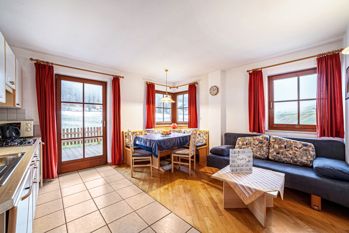 Bright and comfortable, furnished in typical mountain style, 70 mq, Laurino accommodates up to 5 adults, in a quiet, central and panoramic location, 1450 m.a.s.l. It consists of: - 2 bedrooms with double beds (one separable) - A fully equipped kitchen with dishwasher - A spacious and bright living room with sofa bed and TV - A terrace with enchanting views on the Dolomites - A bathroom with washing machine - Free Wi-fi - private Bike/Ski Room - One outside parking place