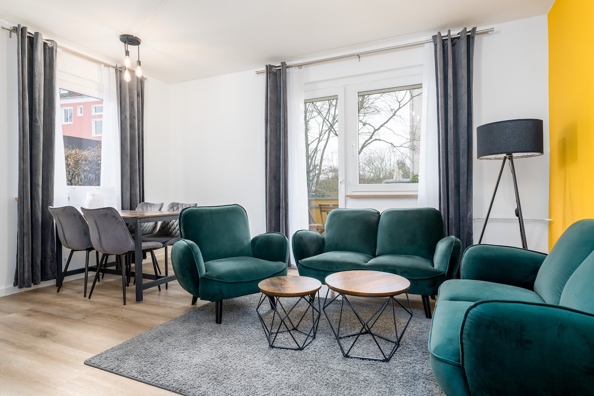 ☆ WELCOME TO IMMO-VISION ☆ This newly renovated 3-room apartment is perfect for 6 people and is characterized by its great design and colorful furnishings. → large terrace with lounge → 24h check-in → Directly at the VW factory and main train station → 2 bedrooms → 3 comfortable queen-size beds → Large shower cabin → Nespresso coffee machine → Fully equipped kitchen → Large living room with 55-inch smart TV → High-speed WiFi → Own parking space in the courtyard → Washing machine & dryer