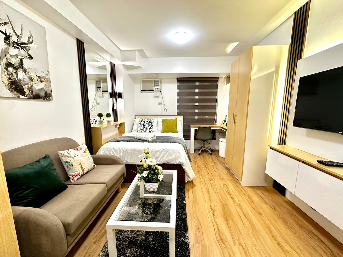 - Newly renovated cozy modern Studio unit in Avida Towers Cebu, IT Park, with great view of Sugbo Mercado from the window just across the street. - Can accommodate up to 4 Guests. 1 double size bed and 1 double size sofabed - Fast Internet speed up to 250Mpbs ++ in Fibre Optic connection - 43" Smart TV with Netflix, Disney+, Amazon Prime, YouTube and more - Walking distance to Ayala Central Bloc - Plenty of Restaurants, Convenient store, Sports Bars, Coffee shops and more just around the corner