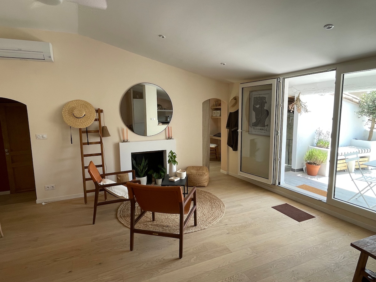 Welcome to our private oasis for 1 or 2 people in the heart of la roquette! Enjoy the heated salt water pool surrounded by tropical plants. The space will offer you a haven of shade and tranquility. Have breakfast, an aperitif, or cook poolside in the outdoor patio kitchen. The bedroom is air conditioned and equipped with luxury hotel quality bedding and organic linens, to ensure that your stay is relaxing and memorable.