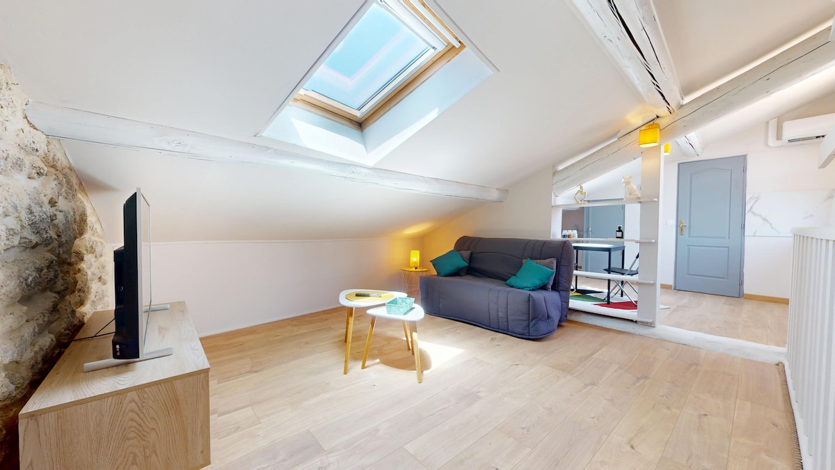 Duplex de charme, calme et confortable situé en plein coeur du centre ancien dans le quartier des artistes juste à coté des Halles gourmandes (7 min à pied du Palais des Papes et du pont d'Avignon). L'appartement de 70m2 d'une hauteur sous plafond de 5m est climatisé et dispose de 2 chambres (1 lit de 140 et 2 lits de 90 pouvant être réunis en lit de 180). La grande pièce de vie avec sa cuisine ouverte dispose d'un canapé convertible en lit avec sommier et matelas (confort d'un lit).