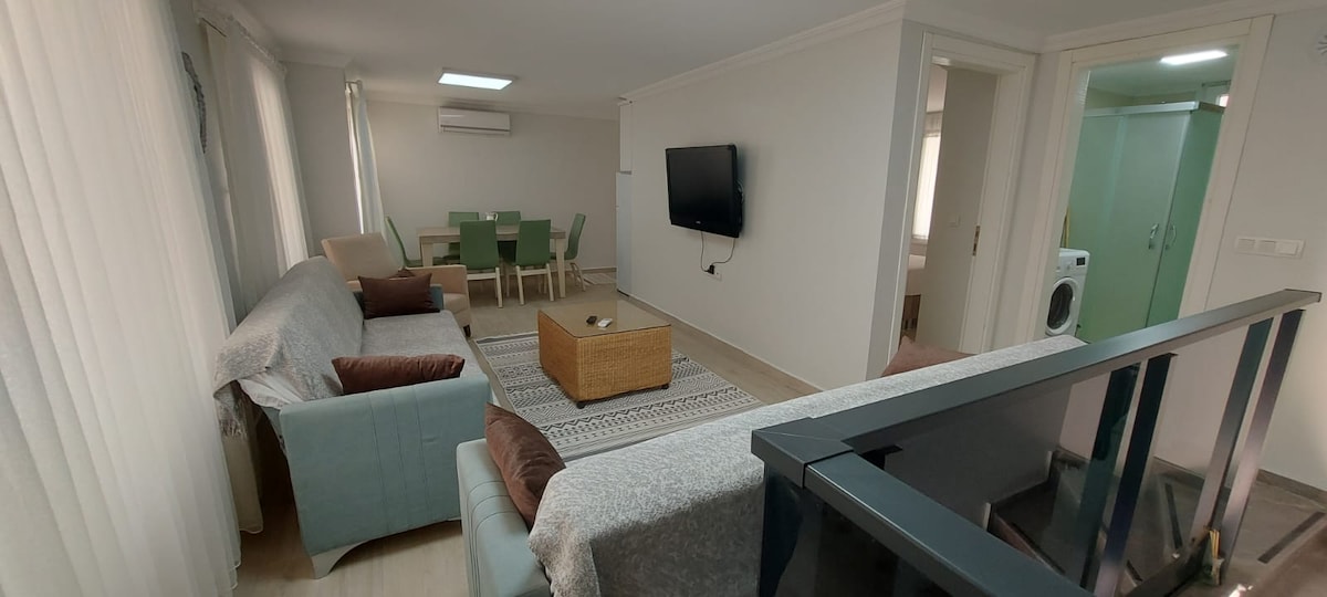 Bu huzurlu konaklama yerinde ailece dinlenebilirsiniz. Dairemiz iki adet yatak odasından oluşmaktadır ve her iki yatak odasında da çift kişilik yataklar mevcuttur. Salondaki L Koltukta da bir kişi çok rahat bir şekilde yatabilmektedir. Yürüyerek İğdeli Plajına ulaşabilir. Toplu ulaşım ile şehir merkezine dakikalar içinde ulaşabilirsiniz. Otopark problemi yaşamazsınız. 200-300 m içinde lokal marketlere ulaşabilir, isteklerinizi kolayca karşılayabilirsiniz.