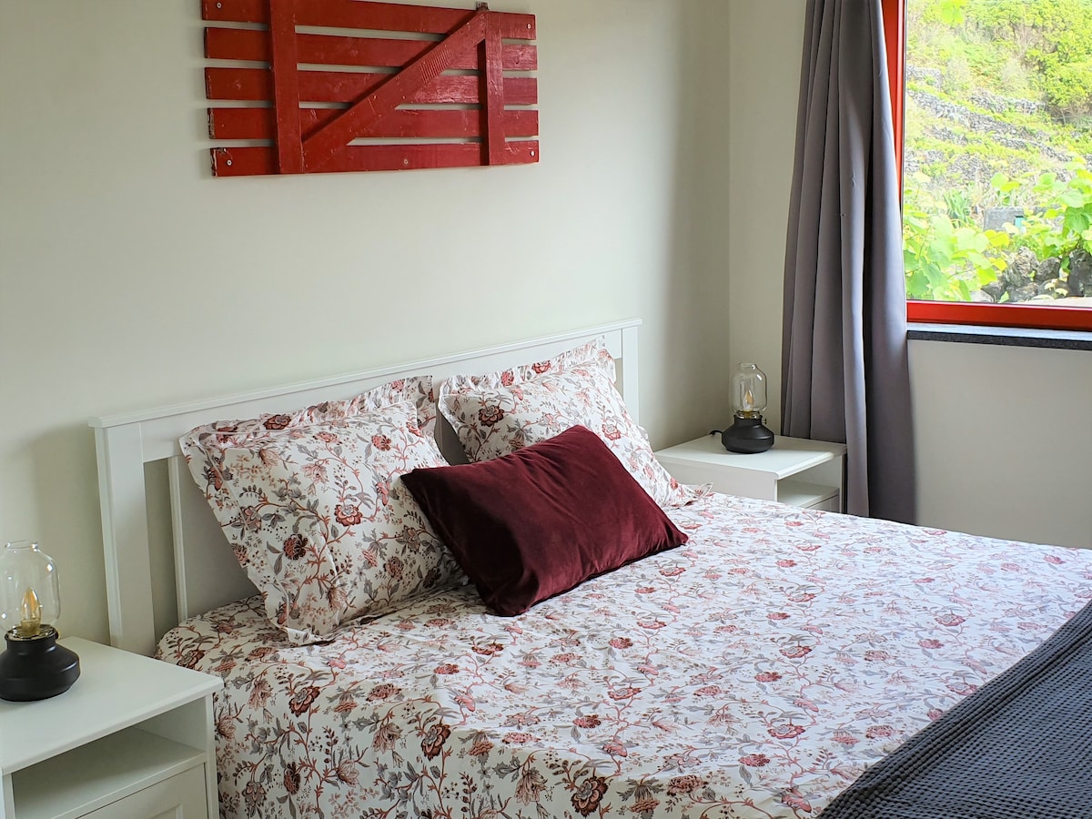 Relaxe neste cottage com um spot único e tranquilo. Aprecie na piscina, jacuzzi ou sauna a vista fantástica sobre o Faial, o mar e a vila da Madalena. Desfrute de uma linda casa em madeira num lugar único e especial com piscina, jacuzzi e sauna. Beneficie dos passeios pedestres com vista para a maravilhosa montanha do Pico. As nossas acomodações situam-se a 2 minutos de carro e 20 minutos a pé da Vila da Madalena, incluem um quarto com cama de casal e uma sala que dispõe de sofá cama.