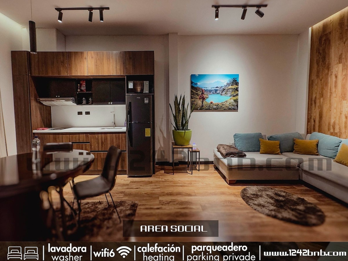 Disfruta de este espacio tranquilo que mezcla comodidad, elegancia y diseño., ubicado en el cuarto piso, junto a la rivera del río Tomebamba, en la zona más exclusiva de Cuenca, a 7min - 2.8km del parque Calderón. Cuenta con todos los servicios, espacios cómodos, internet de alta velocidad, cocina equipada, parqueadero privado, seguridad privada las 24horas, ascensor y generador de energía eléctrica, para que su estadía sea agradable, tranquila y segura.
