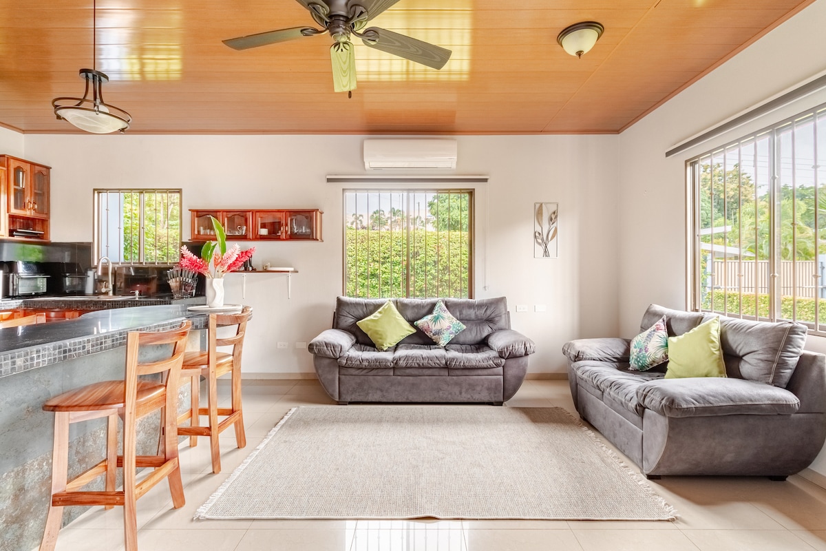 🏡 Enjoy Uvita from a private home perfect for families and friends. Just a 5-minute walk to BM supermarket and pharmacies, and very close to the beaches. 🛏️ 3 bedrooms with A/C, plus A/C in the living room for extra comfort. 🛁 Jacuzzi for two with hydro-massage 🌴 Large garden and fully fenced property 🚗 Private parking for up to 6 vehicles 🔧 Fully equipped for long stays: full kitchen, high-speed Wi-Fi, and comfortable spaces to work from home.
