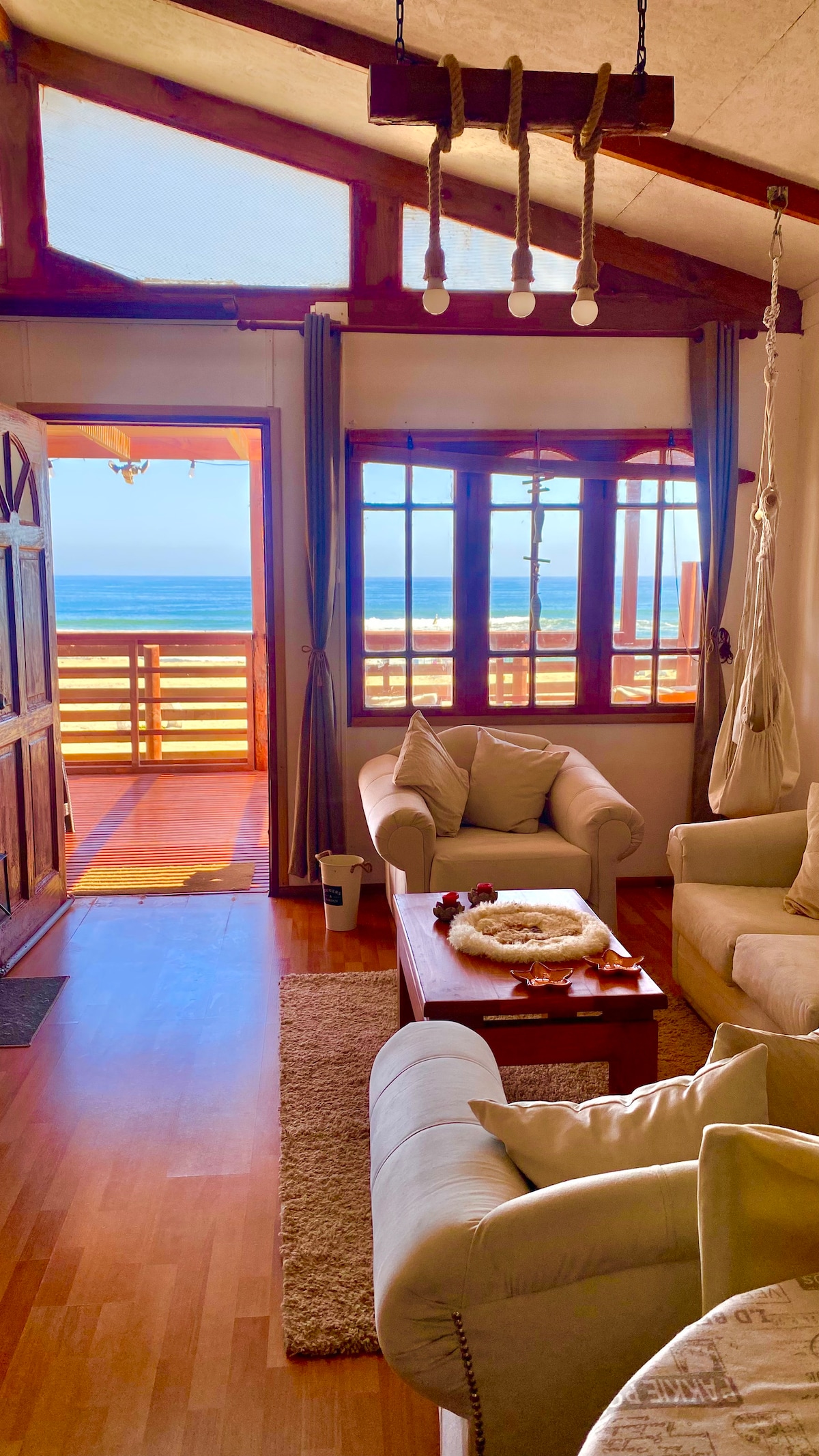 Acogedora cabaña totalmente equipada hasta para 6 personas, a pasos de la playa principal de Bahía Inglesa. Cuenta con 4 habitaciones, 2 baños, cocina equipada, televisión satelital en el living, lavadero con lavadora y secadora, estacionamiento techado y parrilla. La ropa de cama y las toallas de baño están incluidas. La cabaña está ubicada en primera fila con vista libre hacia el mar.