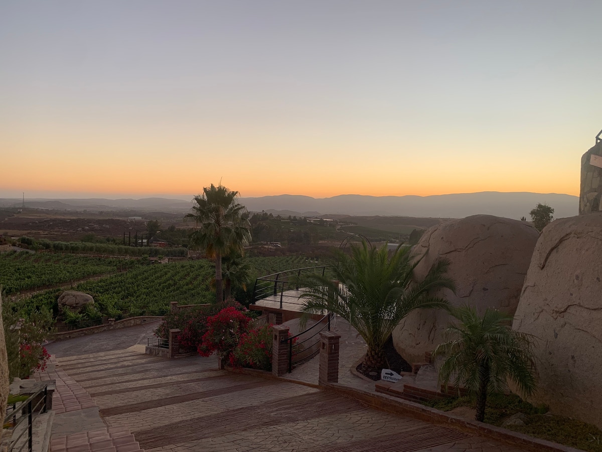 RANCHO ANGELINES Cabaña privada en el valle de Guadalupe con espectacular viñedo y un mayordomo. También cuenta con desayuno ,comida o cena si es que los huéspedes los desean (se cobra extra por platillo). Contamos con un camino de hiking donde podrás explorar el arrollo y los diversos caminos dándote una experiencia de adrenalina entre piedras blancas gigantes dentro del arrollo. Otra ventaja es que puede solicitar servicio de masaje en la terraza, tmb tenemos experiencia offroad