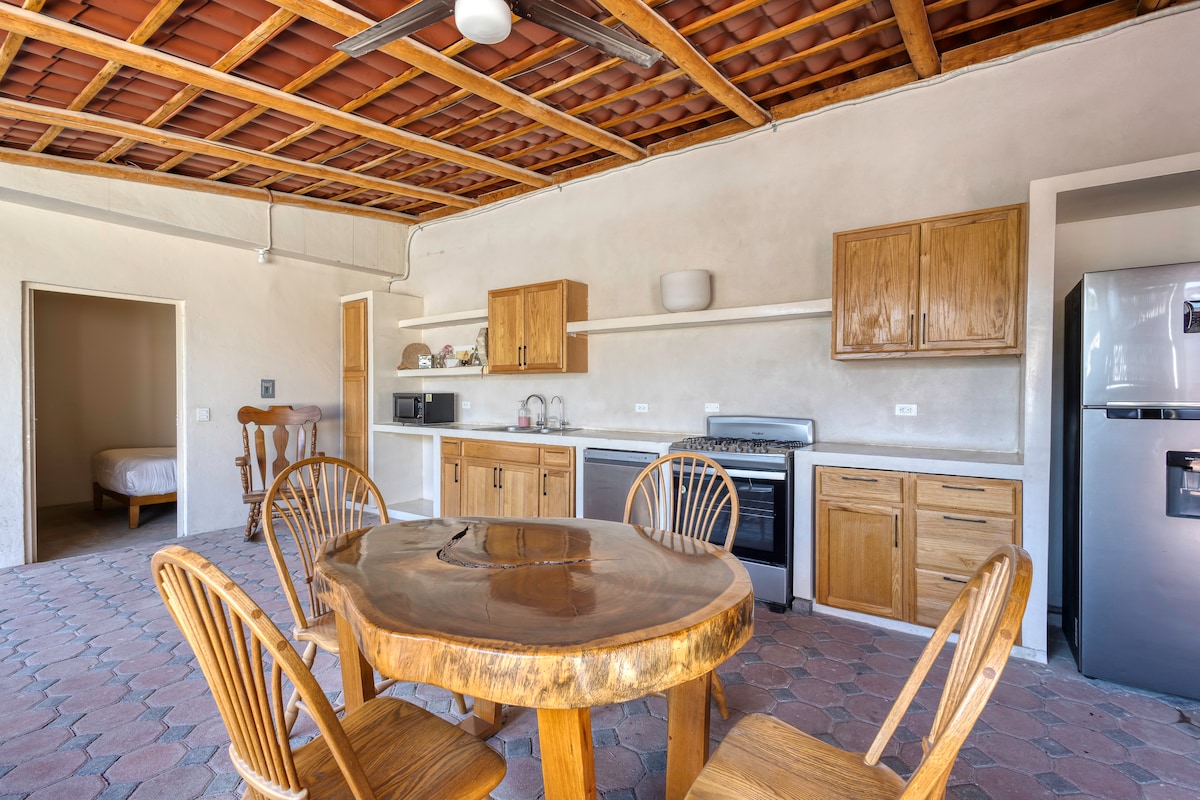 Your Todos Santos getaway starts at this enchanting one bedroom casita. The cozy bedroom features a luxurious king sized bed with La Bohemia linens and mattress. Enjoy amenities such as Starlink WiFi, AC and outdoor bar/ kitchenette. The lounging cabana and pool make this retreat truly relaxing. Watch the sunset over the ocean from your bedroom perch. Enjoy a short stroll to the beach and top restaurants nearby. You are sure to make fantastic memories with a staying at Casita Sueno.