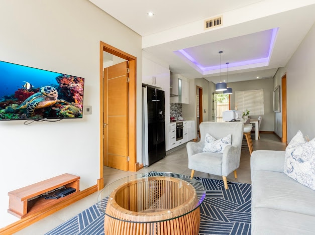 Luxury ground floor apartment with large patio. Modern decor with fully fitted kitchen. Free uncapped fibre with 55 inch Smart HD TV. Netflix provided. DSTV NOW is available with your personal log in. Kids are treated to a great outdoor play area with jungle gym and stunning pool with super-tube ! There are 2 rooftop pools with gas braai facilities and amazing sea views. Perfectly located, 5 minutes from both Umhlanga and Umdloti, 10 minutes from King Shaka airport.