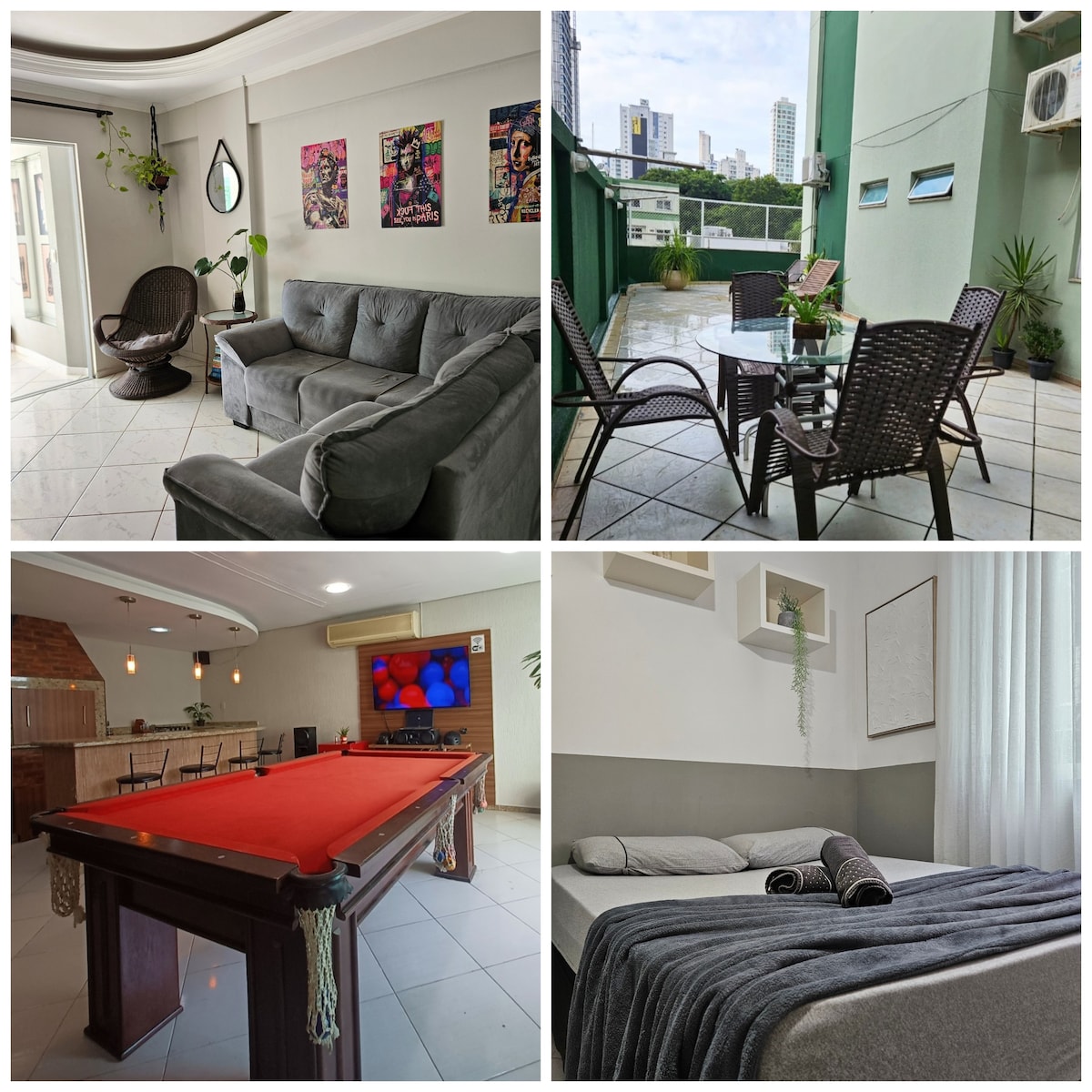 Apartamento de 1 quarto, ar condicionado, ótima localização, uma quadra da praia, com piscina, churrasqueira e vaga de estacionamento/garagem. Viva o melhor de Balneário Camboriu neste imóvel aconchegante com área de lazer e portaria 24 horas. O apartamento é composto por sala integrada com cozinha, um quarto, banheiro e sacada. Ar condicionado na sala e no quarto Rede de proteção nas janelas, sacada sem rede FORNECEMOS ROUPA DE CAMA (1 jogo) ROUPA DE BANHO ( 1 jogo por hóspede ) por estadia
