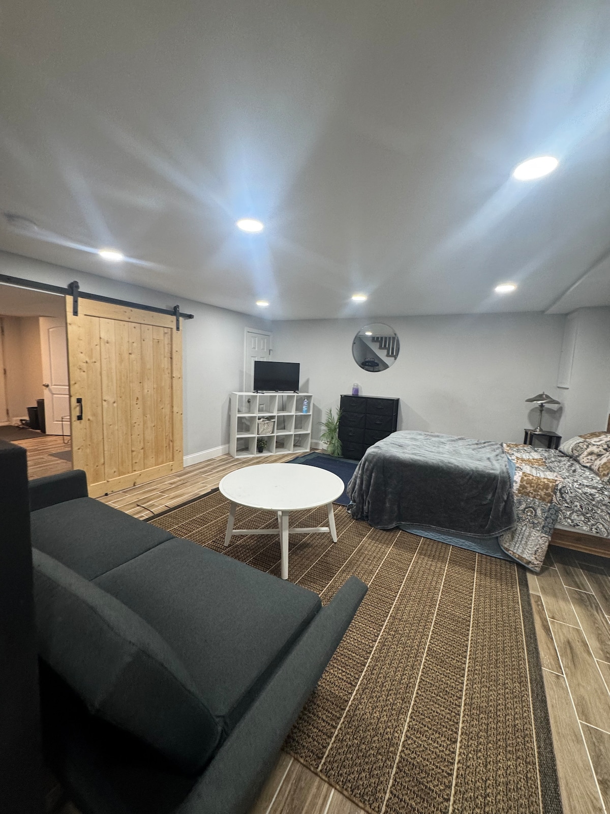 Entire basement only not the entire house. A basement apartment recently renovated with 2 bedrooms, luxurious full bathroom, powder room, full kitchen, dining room, living room, laundry in the unit, private entrance, private parking (max 2 cars). Host lives upstairs with 1 dog (labradoodle). Everything in the basement is not shared with the host. Pets allowed with $75/trip fee, no fee for service dogs (Note: emotional support animals are pets) 0.5 mile from I-95, 20 minutes from BWI airport.