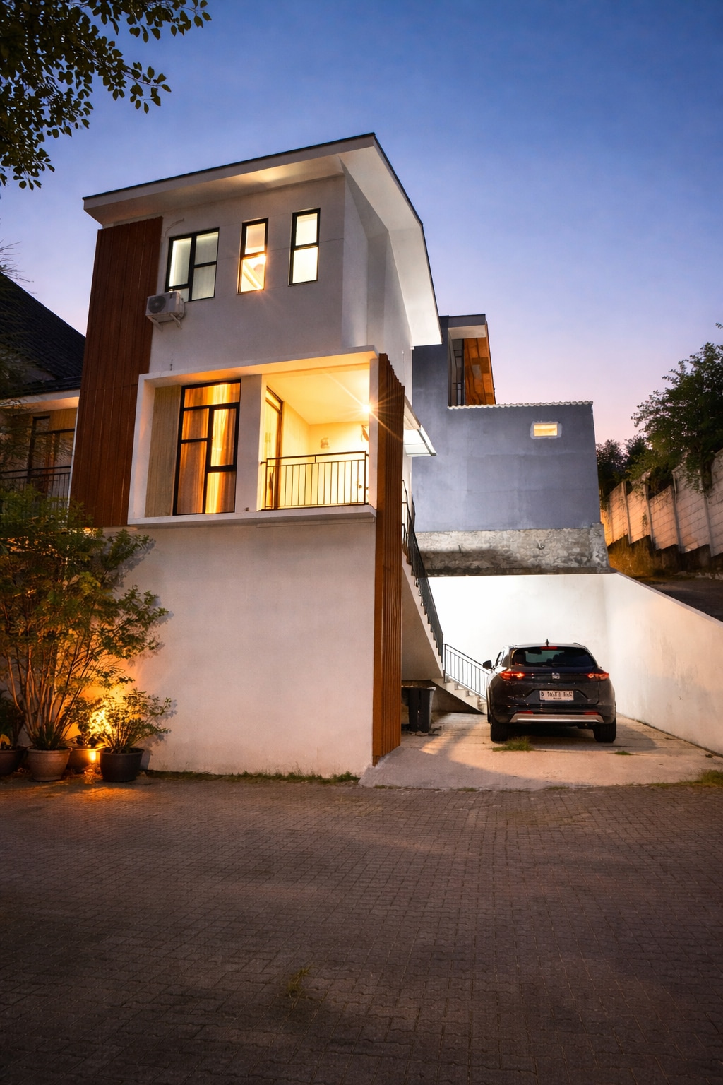 This tropical villa in Bandung offers a peaceful retreat amid lush forest surroundings. Designed with sustainability in mind, its open spaces, natural wood accents, and large glass walls invite nature indoors The rooftop deck provides panoramic city views, ideal for quiet moments or sunset watching. The pool area features a stunning staggered terrace concept, creating multiple levels for relaxation while blending into the natural landscape. With eco-conscious touches like recycled wood furniture