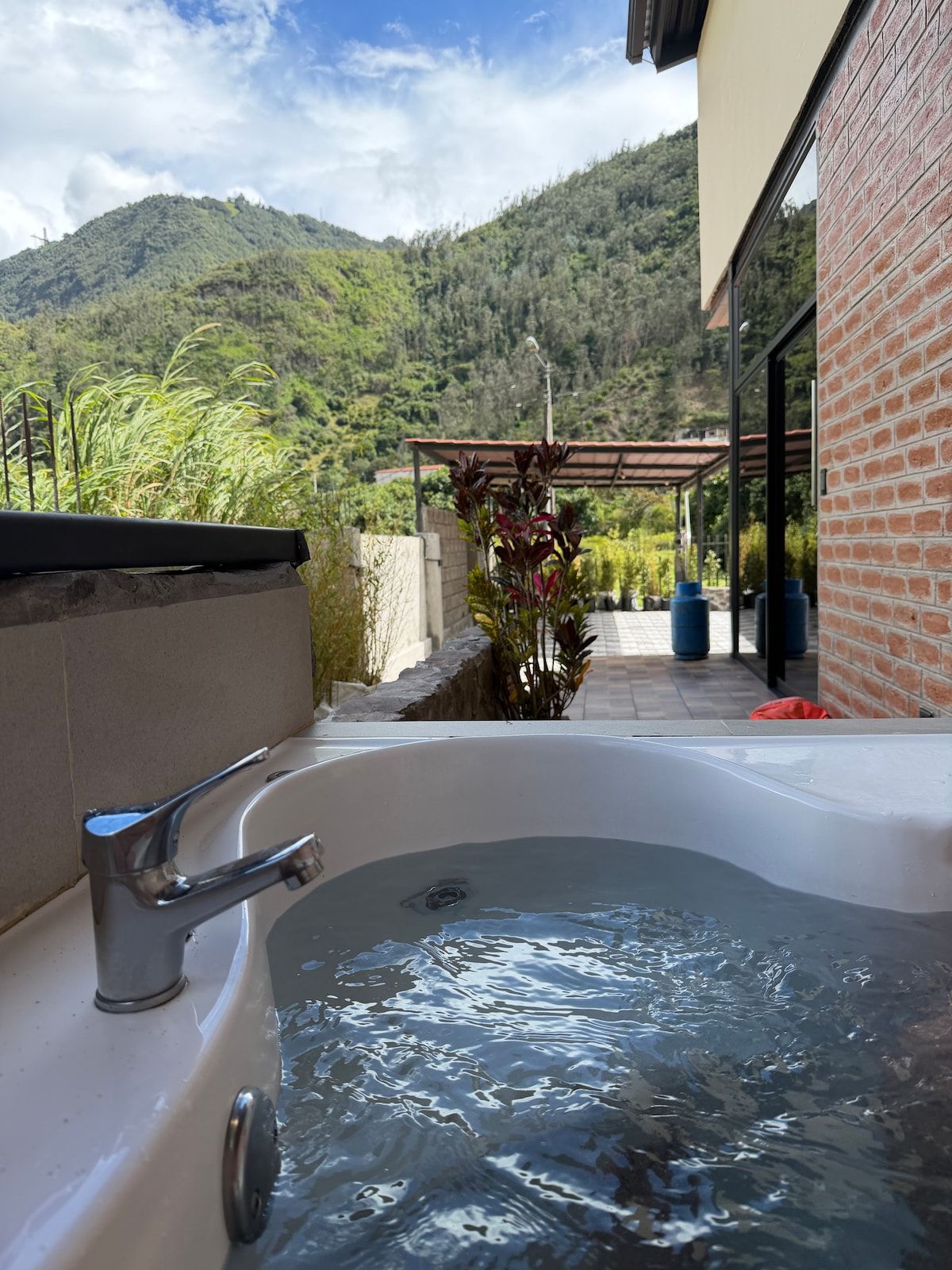 A quiet place to disconnect, 5 minutes from the center of Baños, this property is new, recently furnished, with floor-to-ceiling glass windows, it offers spaces to connect with nature. Modern and illuminated, it has an outdoor jacuzzi and outdoor terrace The master bedroom has a privileged view of the mountains and a few steps from the Chamana waterfalls High-speed fiber optic Internet is perfect for people who work remotely.