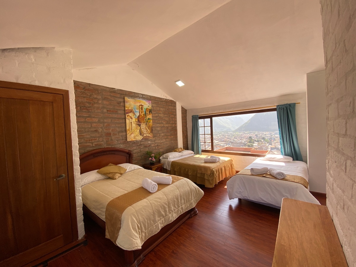 Rustic style hotel Inti Luna with spacious rooms nestled close to volcano Tangurahua in Baños, Ecuador. We have rooms for single, double, triple and quadruple occupancy. Rooms are spacious with comfortable beds and private bathrooms. There is a big garden and hammocks for you to relax. Also a kitchen to make your own food or have breakfast included if wanted. We are only few minutes of walking to the center of Baños and we are very close to thermal baths. We also provide tourist information.