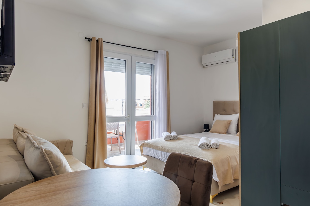 Enjoy the modernly equipped apartment.This brend new house is located in the quiet part of Zeleni Pojas. The apartment has * one bedroom with a double bed *another room with a double bed and a single bed *big balcony * bathroom *the dining room * living room with a pull-out corner furniture * fully equipped kitchen *smart TV *espresso machine *air conditioning *wi fi *free parking Perfect for a family,couples or a group of frends. The nearest beach is 300m away. Mini market 100m away.