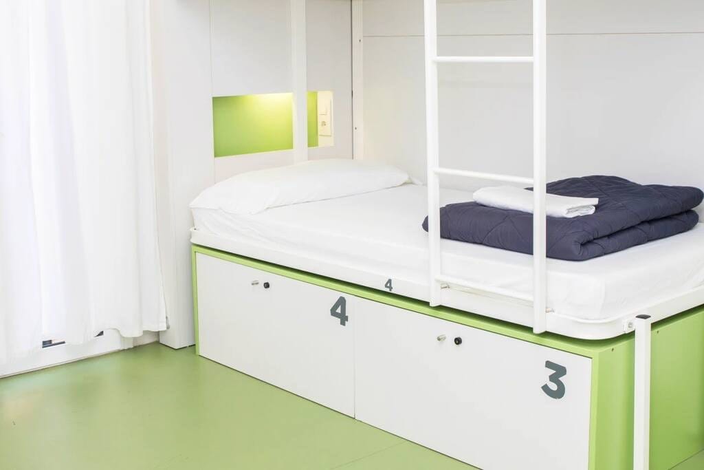 10 Mix Room. (Share room) This room is exterior. No smoking Our dormitories are designed with a touch of Mediterranean flair, complete with airconditioning, personal reading lights, power sockets, and secure lockers for your peace of mind. Age Policy for Dormitories: We welcome guests aged between 18 and 48 in our dormitories. ● Tourist Tax: €7,70 per person, per night. ● Linens are included but we don,t provide towels. ● Towel Rental: €3 ● Special Dinner Nights: €6
