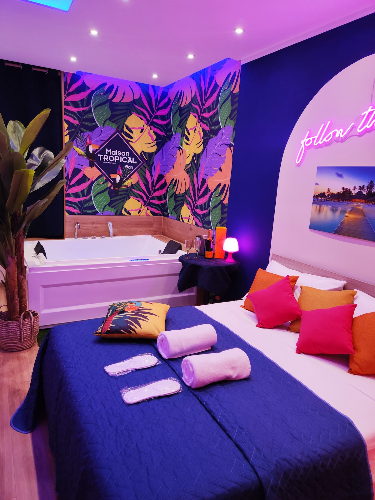✔ Luxury Apartment ad uso esclusivo ✔ Vasca idromassaggio king size in camera ✔ Esperienza tropicale e multisensoriale ✔ Vicino centro e stazione di Bari ✔ 2 camere da letto con balconi ✔ LED e neon light atmosphere ✔ Cucina attrezzata ✔ Collegamenti Bus e Treni per la Puglia e visitare : Mola, Monopoli, Polignano a mare, Alberobello, Trani, Bisceglie. ✔ Vicino a Ristoranti, Sushi, Bar, Shopping, Spiaggia Pane e Pomodoro