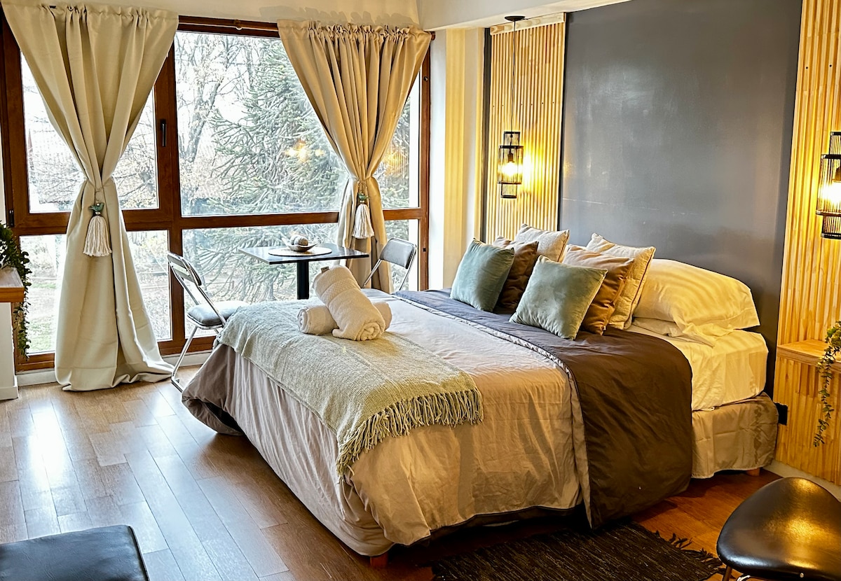 Welcome to your boutique retreat facing the majestic Lake Nahuel Huapi, featuring panoramic views, a heated pool, jacuzzi, and gym. Modern design and comfort, just 15 minutes from downtown Bariloche. Located in a peaceful area, ideal for couples or travelers seeking relaxation. Wake up to unique views of the lake and mountains, surrounded by nature and Patagonian style.