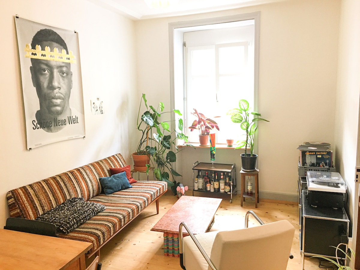 Charming 4-room apt., with outdoor dinning possibility, furnished with pieces that functional, once made with love. 10'-walk to the old town, the river Rhein . Supermarket is across the street. Largest park of city is around the corner. Free public transportation is provided via BaselCard: Public trans. hubs within 2' walk: direct 10'-tram to SBB train station, direct 10'-bus to Basel Europa airport, direct 15'-tram to Messeplatz, etc.