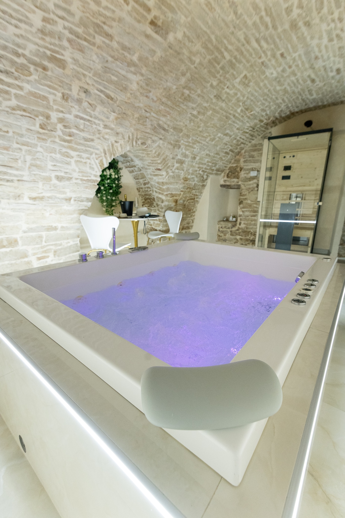 Elegant and spacious apartment (77 sqm2) with private underground spa, carved into the rock, equipped with turkish bath, shower area, king size jacuzzi. Located in via Fiorentini, the main street of the Sasso Barisano, it is ideal for enjoying the Sassi of Matera to the fullest. Strategic and easily accessible location. Upstairs is the bedroom with its own bathroom. On the ground floor the master bathroom, the kitchen and a splendid living area, connected to the wellness area on the lower floor.