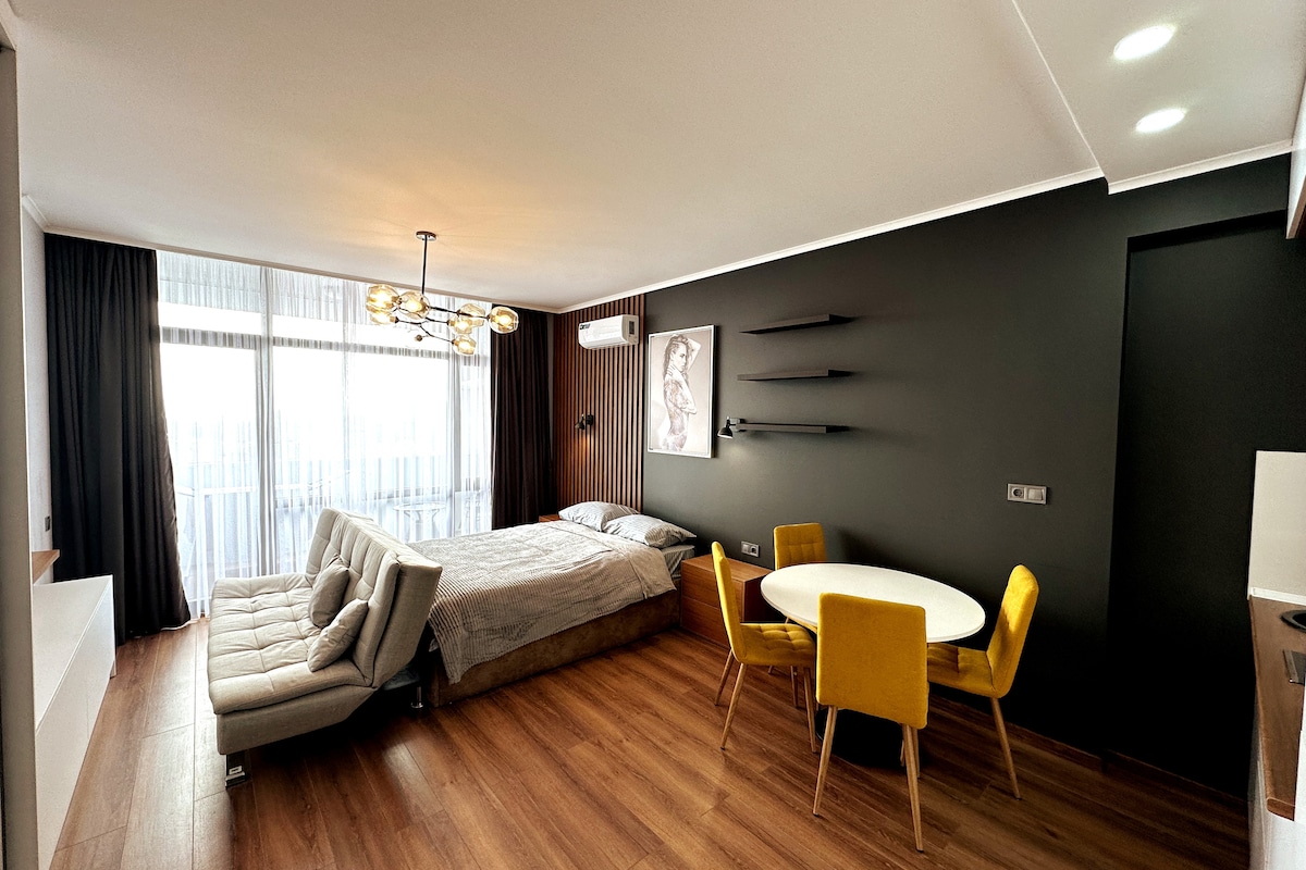 Newly decorated studio apartment is ready to host its first guests. Here you can find everything you need for your stay: Fully equipped kitchen, coffee maker, AC, Washing machine, fridge. Everything is brand new and sparkling clean. And of course, you can enjoy the beautiful sea and city view from the 24th floor terrace. The apartment is located close to McDonald, 10 min walk to the sea. The studio is 32 sq.m, has 1 double bed and so far 1 additional inflatable bed (before couch arrives).