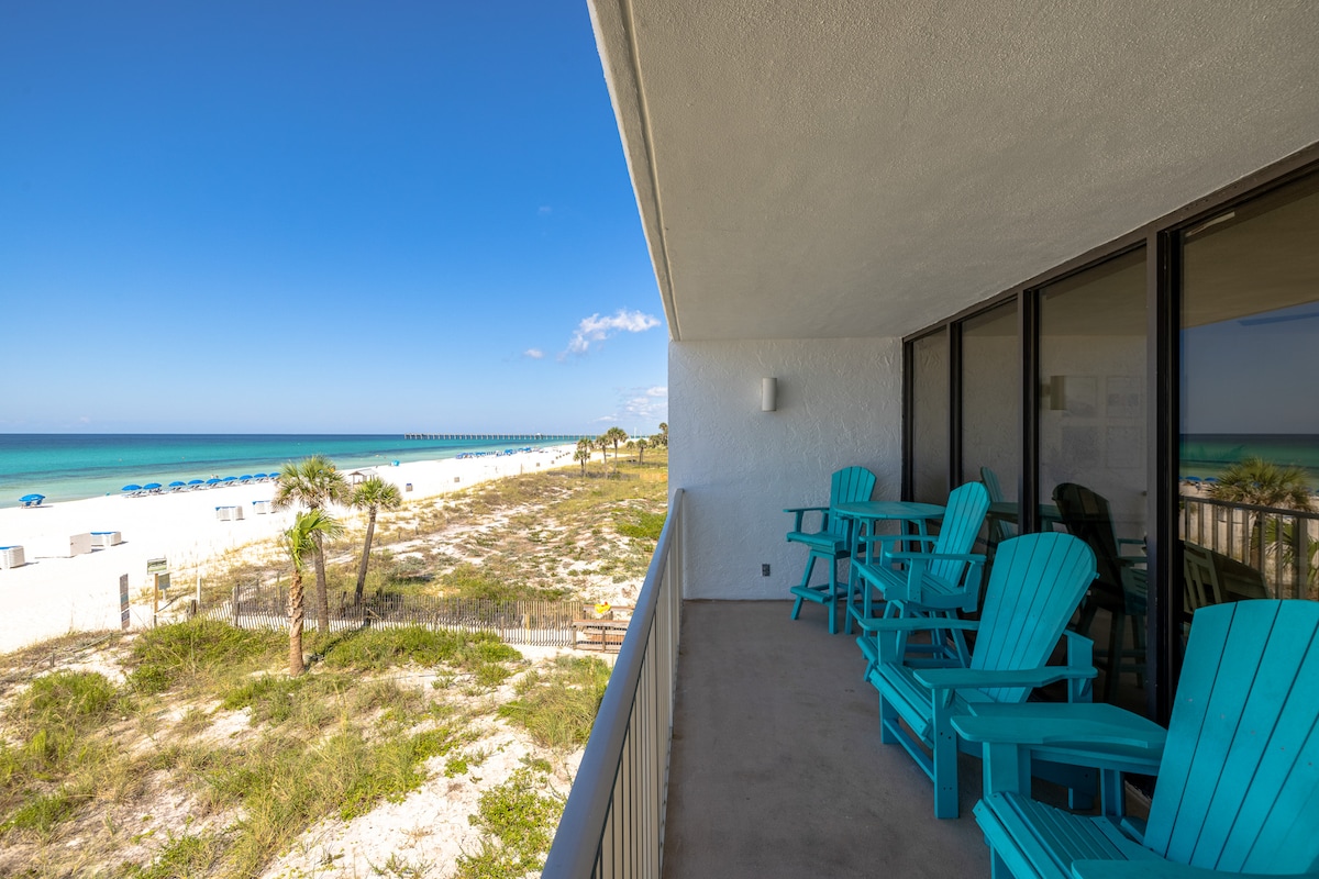 “At Last” Wake up to a wall of glass with romantic Emerald Gulf View & white sugar sand on 7th floor with beautifully appointed decor. Easy access to everything from this centrally located stunning retreat in one of Panama City Beach's top tier resorts just 5 min to Pier Park. Enjoy Emerald Beach Resort's private parking, multiple pools, tiki bar, fitness center, game room, . FREE beach chairs & umbrella Mar 15 -Oct 31