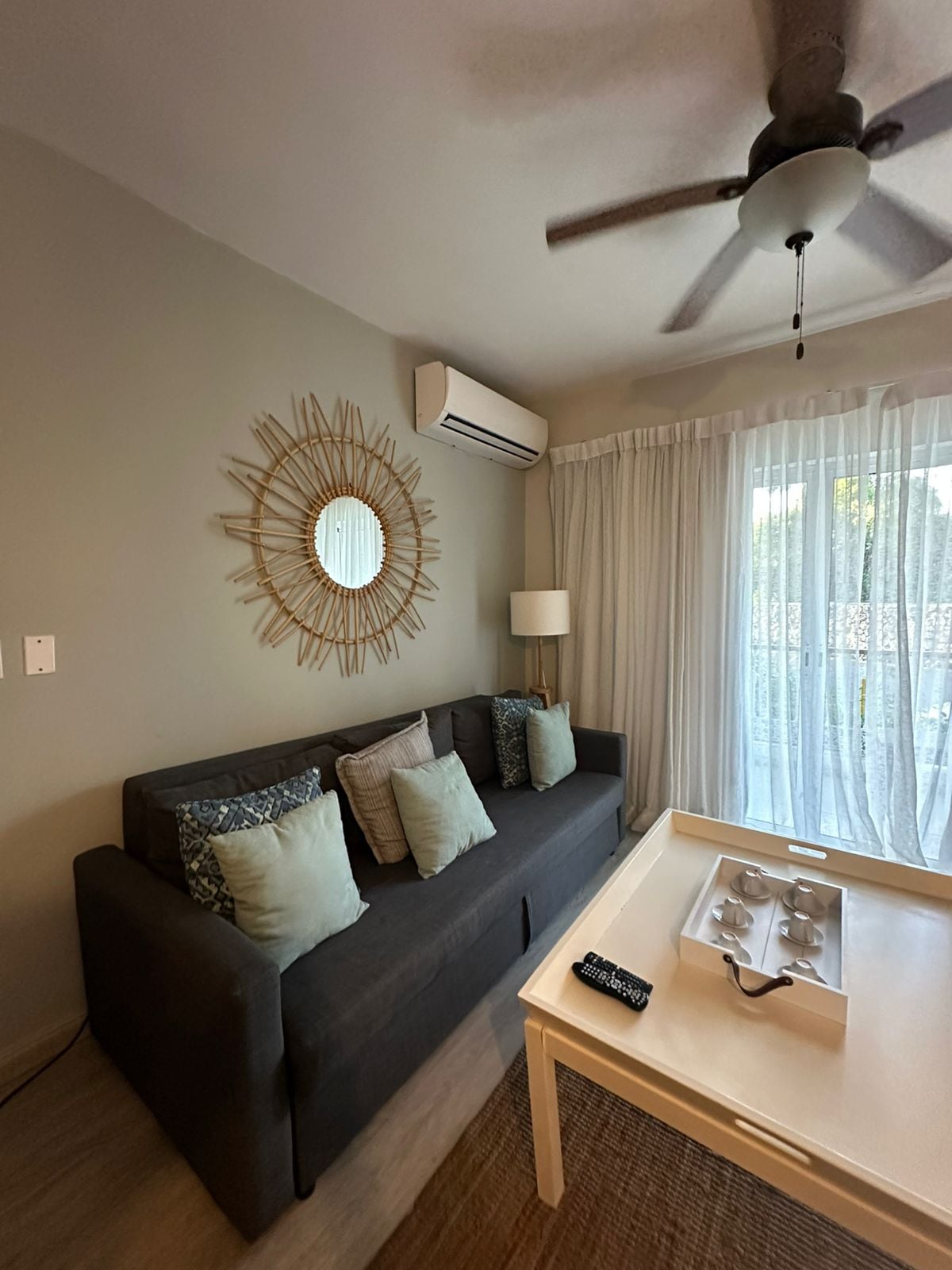 European charm - Caribbean style, Cadaques Caribe, nested on a private white sandy beach in Bayahibe, is the perfect destination for a peaceful and relaxed getaway. The apartment is fully furnished and equipped with appliances in the kitchen, air conditioning, ceiling fans, hot water, Wi-Fi, Smart TV in the living room, blow dryers, iron. A master bedroom with a king size bed, private bathroom and a small TV. Second bedroom has a double bed & twin bed with a shared bathroom next to it.