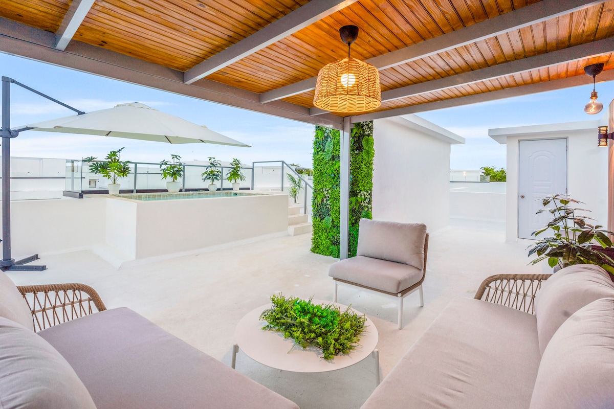 Penthouse con terraza privada y jacuzzi. Ubicado a solo 3 minutos de la playa, este alojamiento combina lujo, comodidad y ubicación perfecta. El penthouse cuenta con: ✨ 2 habitaciones habitaciones 🚿 2 baños completos 🍳 Cocina totalmente equipada 🛋️ Sala principal + family room para mayor comodidad 🌅 Balcón con vista y terraza privada con jacuzzi 🔥 Área de BBQ ideal para compartir 🏊♀️ Piscina y gimnasio de uso común 📹 Seguridad 24/7