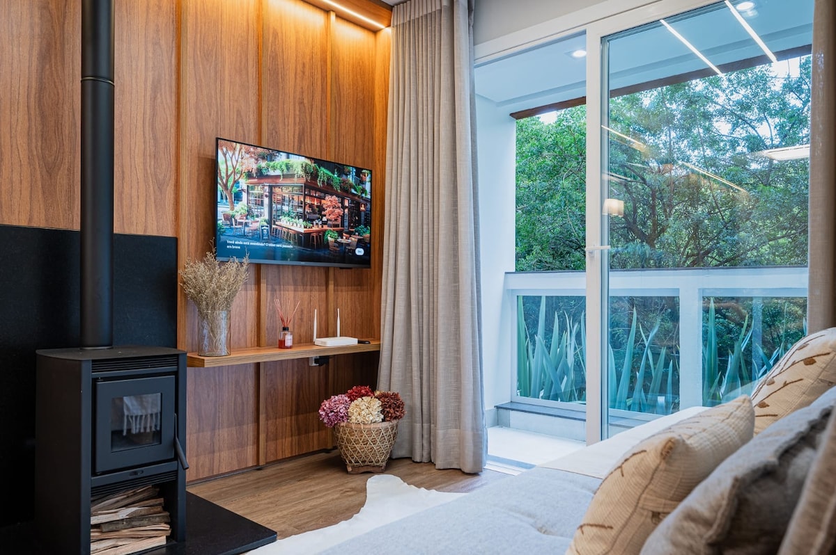 Perfeito para casais e famílias que buscam conforto e tranquilidade em um espaço amplo e cheio de charme! Wi-Fi de fibra, 2 Garagens, Sacada fechada com Churrasqueira, Lareira ecológica, Smart TV 55' e 32' c/ Netflix, Disney Plus e Amazon Prime, Colchões Premium, Chuveiros TOP, área de serviço individual com Máquina de Lavar, aquecimento de água nos ambientes, Ar Condicionado Q/F nos quartos e sala, cozinha completa e equipada, um espaço para café e localizado em um local arborizado e silencioso