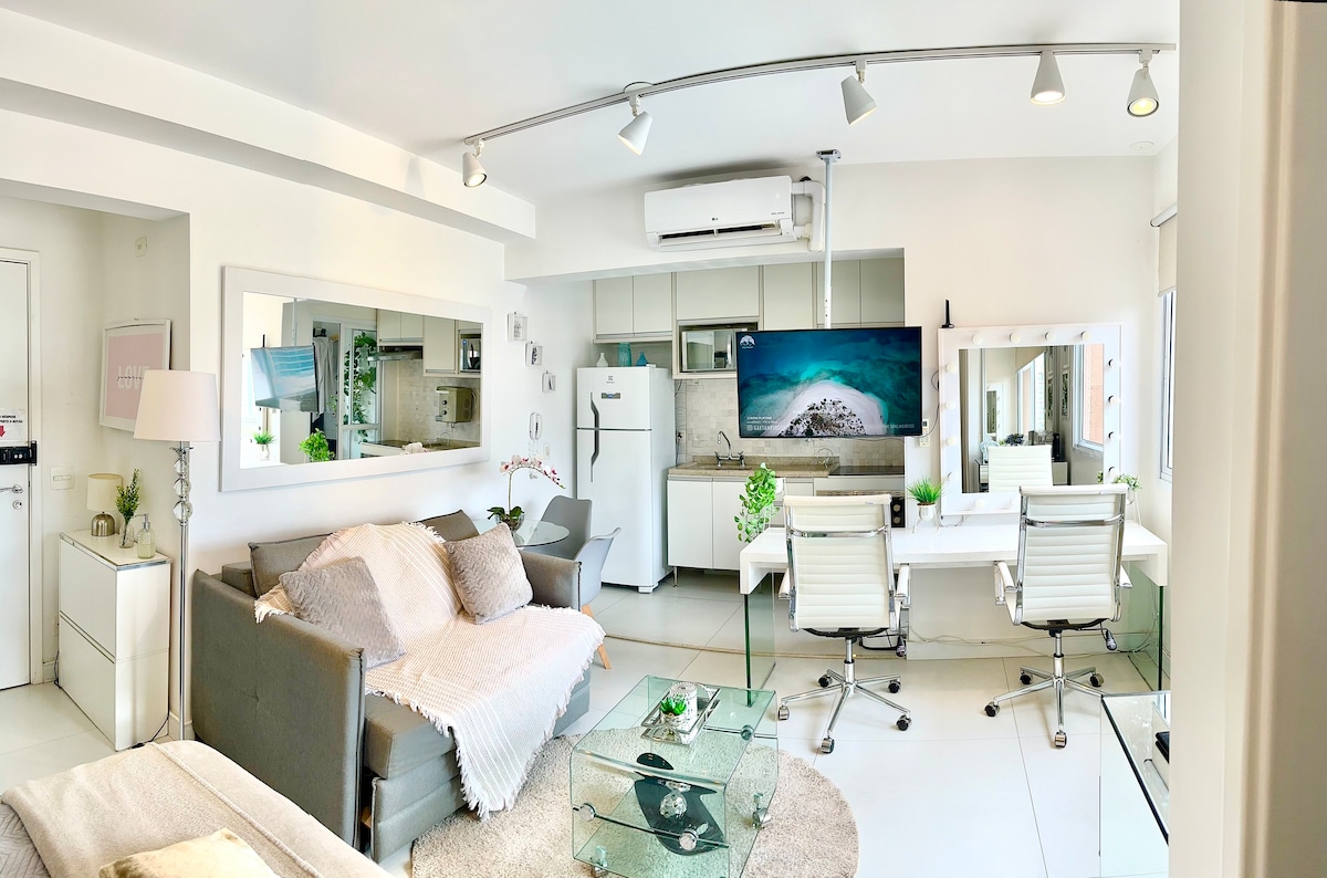 This wonderful Studio was designed to give you all the comfort and practicality you deserve. Modern and functional environment, with smart lighting integrated with Alexa, thought of every detail for you! Enjoy the day at the events surrounding the site or quickly access the city's main thoroughfares. At night, enjoy the bars and restaurants, and then rest comfortably, as the apartment has soundproofing, blackout curtains and silent air conditioning.