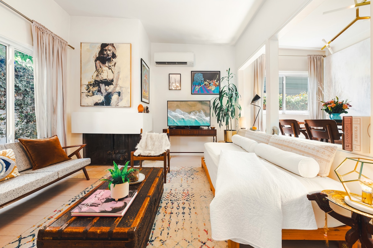 Safe oasis in one of the most iconic cities! Gated, Private Mid-Century Design Guesthouse with Kitchen, Bathroom, Living Room with large windows with courtyard views. Free Parking. Fiber Internet. Gated. Patio. Loft (has low ceiling). Close to Beverly Hills, UCLA, Santa Monica, Hollywood. Beaches, Surfing, Boats in 20-30 mins. Enjoy our OG Tiny Home Guest House! Stairs. Low ceiling in loft. May not be ideal for those with mobility issues.