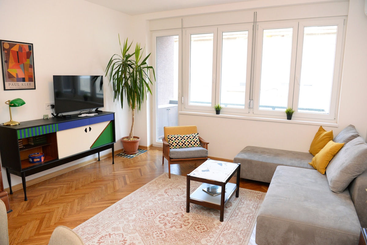 This 80 square meters apartment has two bedrooms divided by large kitchen/dining/living area. The apartment is located in walking distance from major Belgrade touristic sites – National Assembly, Museum, and Theater, Knez Mihajlova street, Kalemegdan Fortress, Skadarlija (the bohemian quarter). The guests can find various food and drink options at nearby restaurants, cafes, and pubs. Some of the top-rated dining places are in this area. There is a 24/7 grocery store down on the corner.