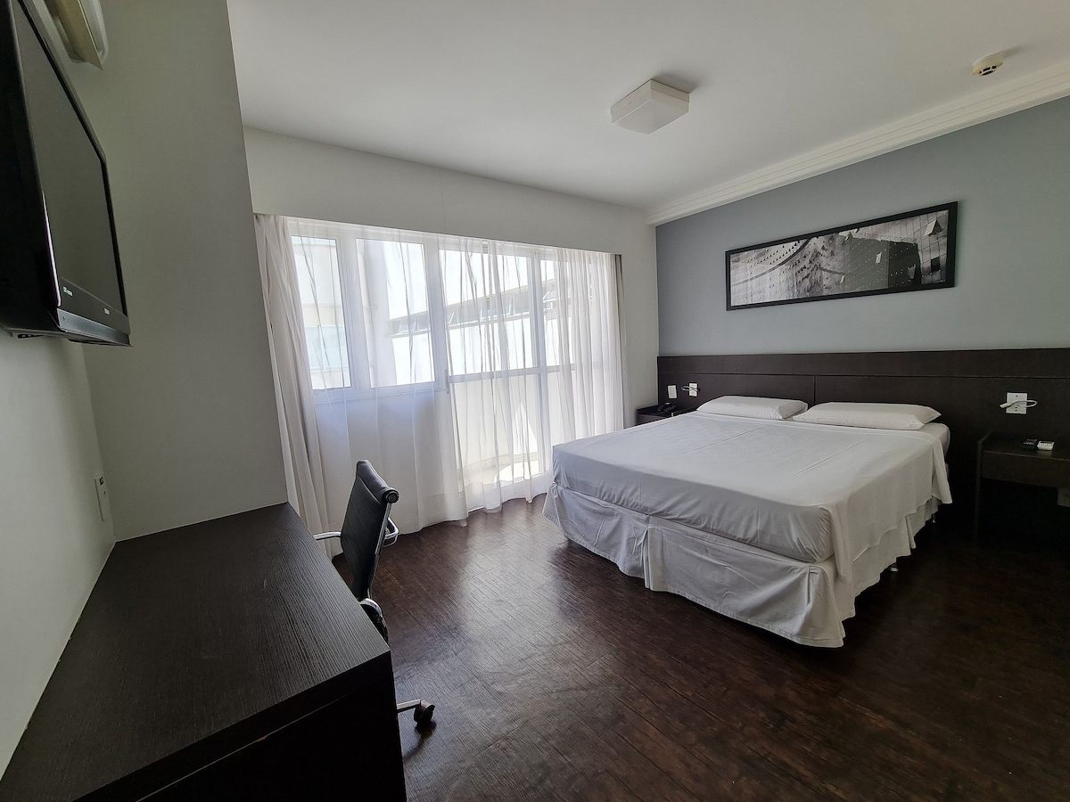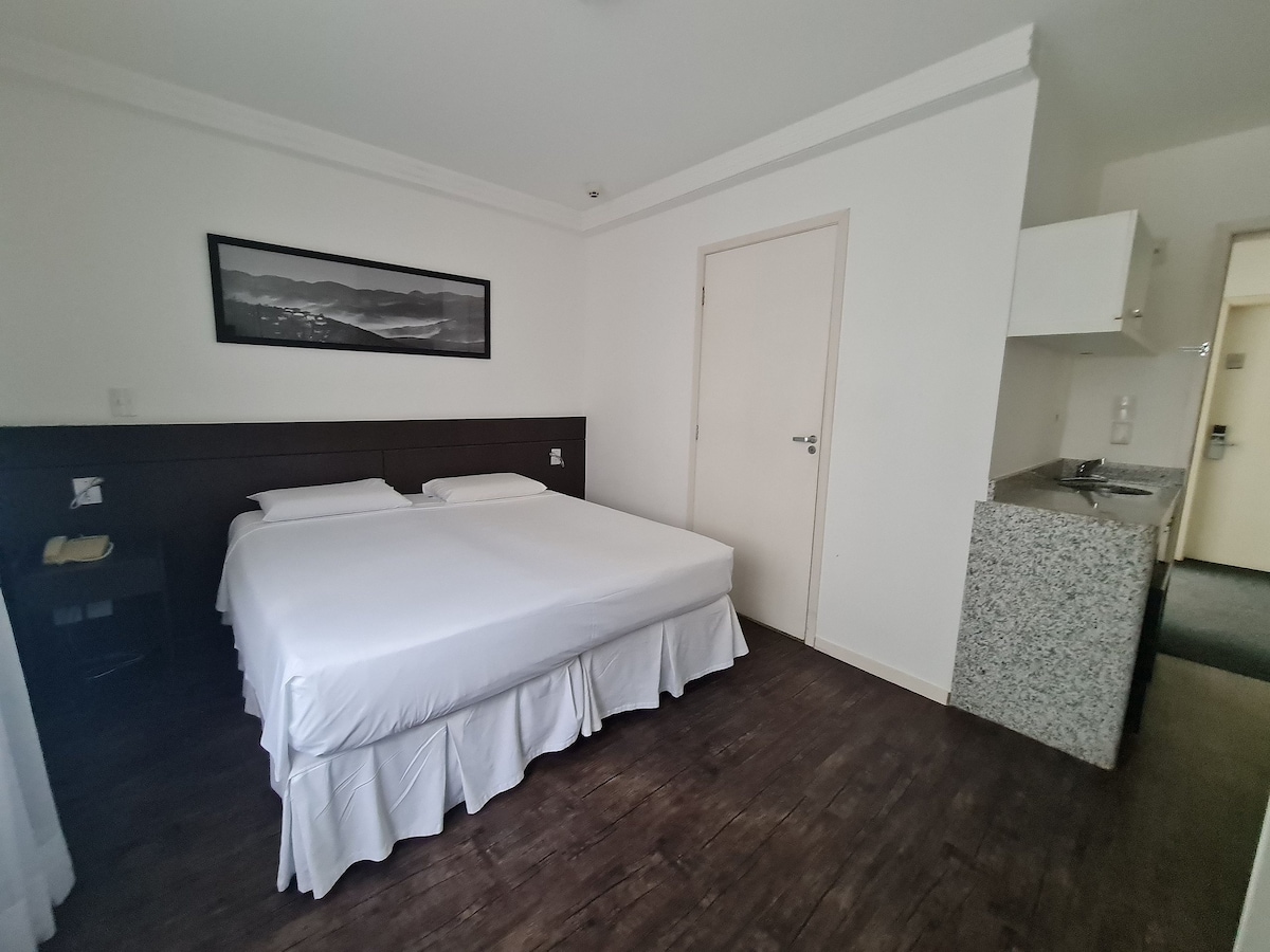 Aqui, tudo é fácil e prático, do início ao fim da sua estadia! O imóvel foi muito bem montado e pensado para proporcionar a melhor experiência possível. Possui uma cama de casal, fornecendo uma sensação de amplitude. É um bom lugar para renovar a energia. É um quarto amplo, mesmo sendo sem varanda. Roupas de cama, 2 travesseiros, 2 toalhas e uma coberta de casal estão inclusas na reserva. Tudo o que você precisa para uma boa estadia