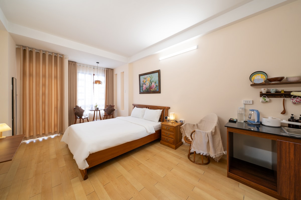 Welcome to Your Urban Oasis! Relax in our 1-bedroom apt for 2 with a wide-view balcony in Japan Town, just 5 minutes from HCM center. Restaurants, bars, cafes, massage spots, and convenience stores are all within a 1-200m walk. On 3rd floor, your Japandi paradise has full amenities. No elevator, but the wide and gentle stairs are a free workout! 💪 Enjoy a 100-inch projector for movie nights, a cozy 1.8m sofa, a fully-equipped kitchen, and a refreshing bathroom.