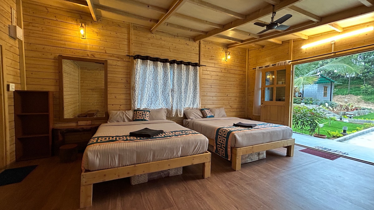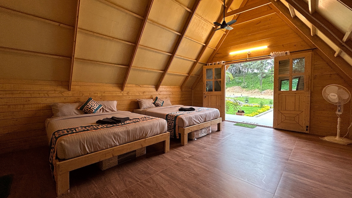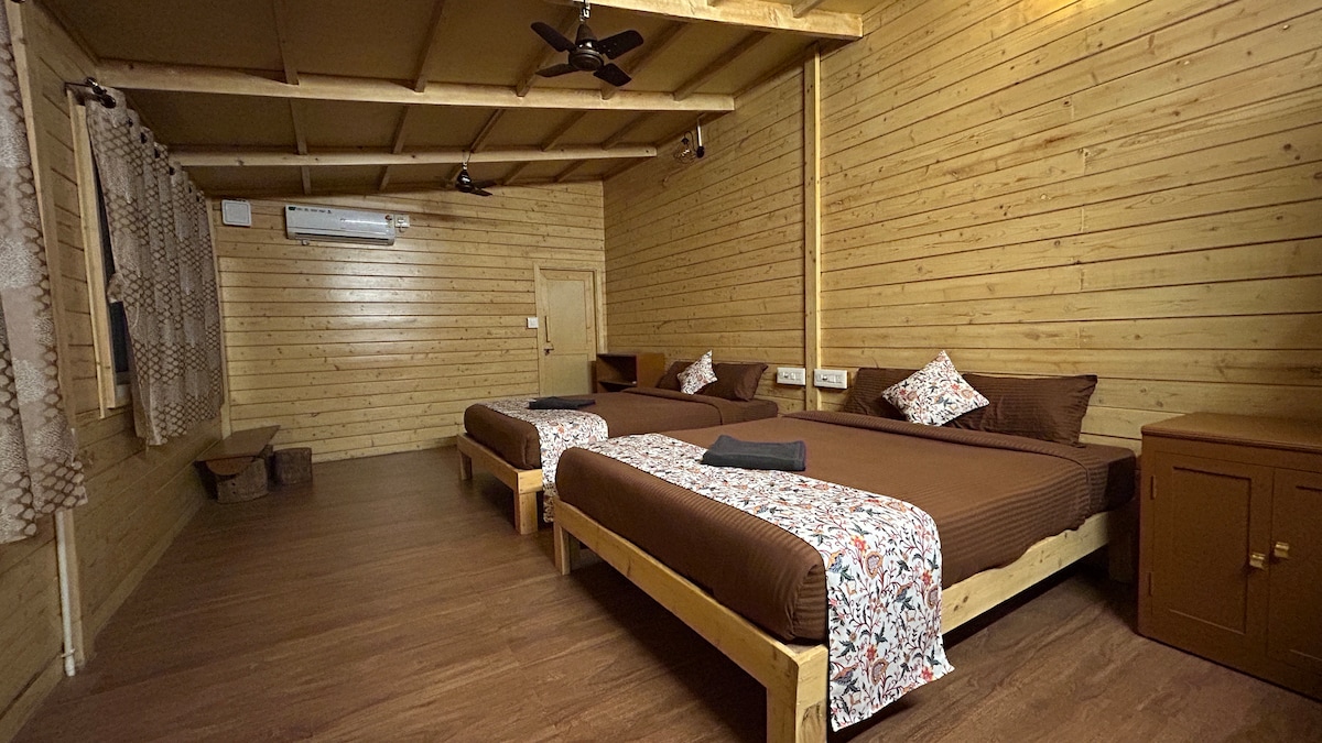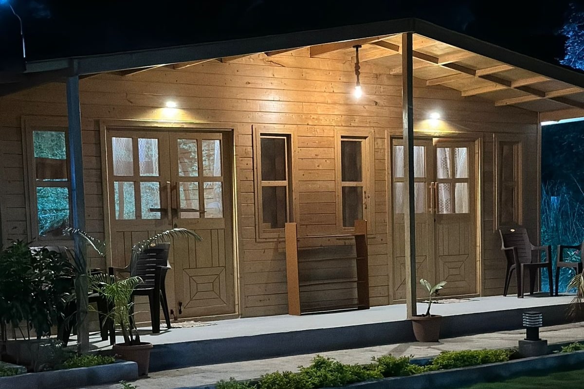 Camp HRID Woods is set in a 7 acre mini forest, a natural stream flows through the property. Guests will have exclusive access to the entire property and its amenities, ensuring complete privacy. The 2 luxury cabins can accommodate 2-3 guests each (max 6 guests in total). Amenities include a deep splash pool (7 feet), cinema, fishing, rope obstacle course, barbeque, bonfire & stargazing with a telescope (some of the activities are chargeable). Sumptuous food is available on a pre-order basis.