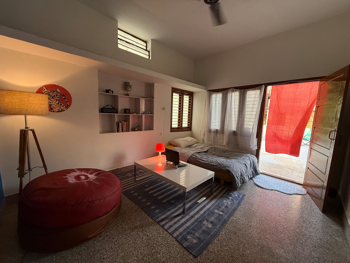 This independent studio is located on ground floor, it has private attached bathroom and kitchenette. The space opens out into a large garden, with mango and coconut trees. This property is located 1 km from the bus stop, supermarket and restaurants! It is part of a larger farm property, which has a few more Airbnb listings. AC available for extra charge: ₹300
